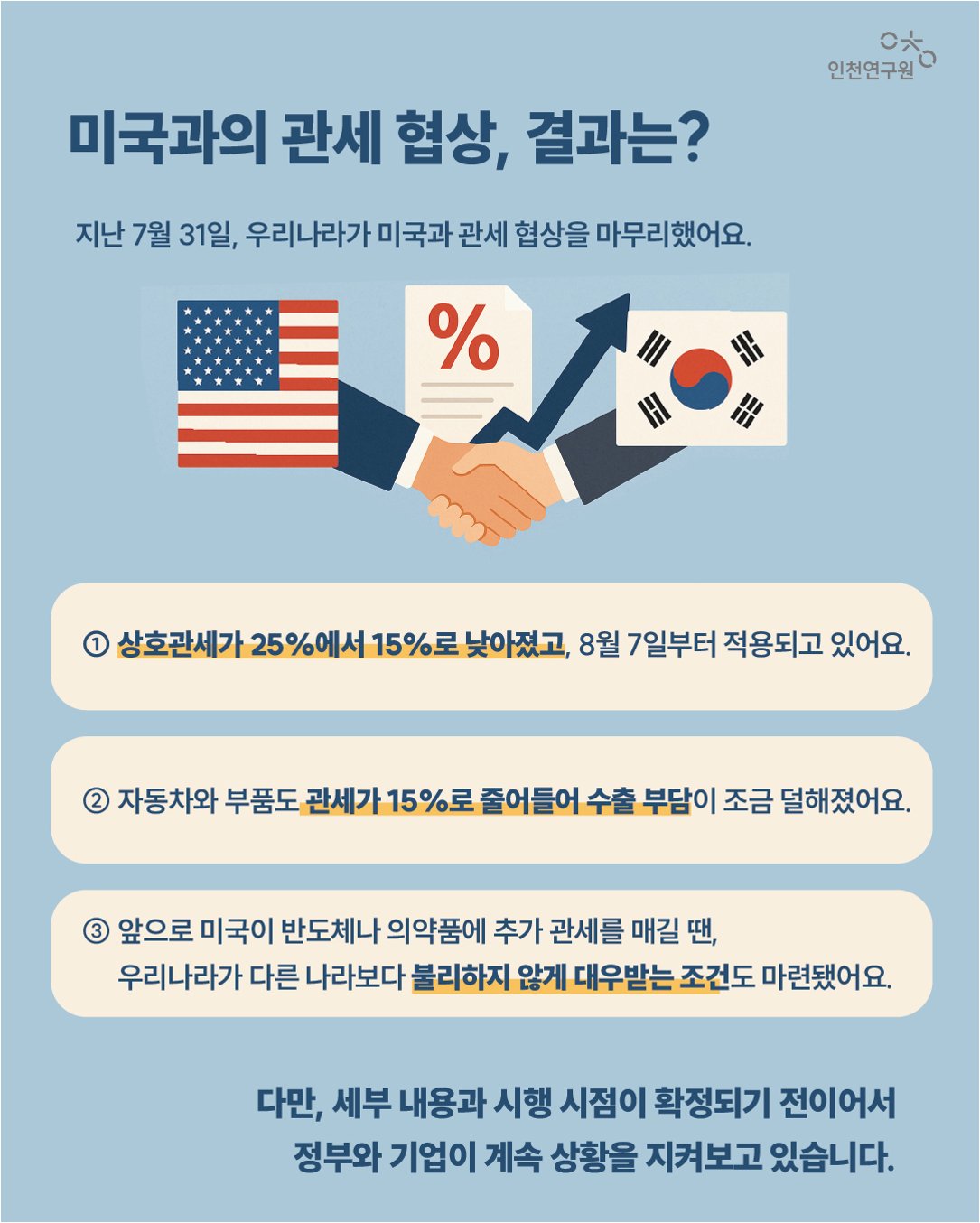 A.관세 협상 타결은 한국 수출 시장의 경쟁력을 회복하고, 불리한 관세 적용에서 벗어나는 데 기여할 수 있습니다.