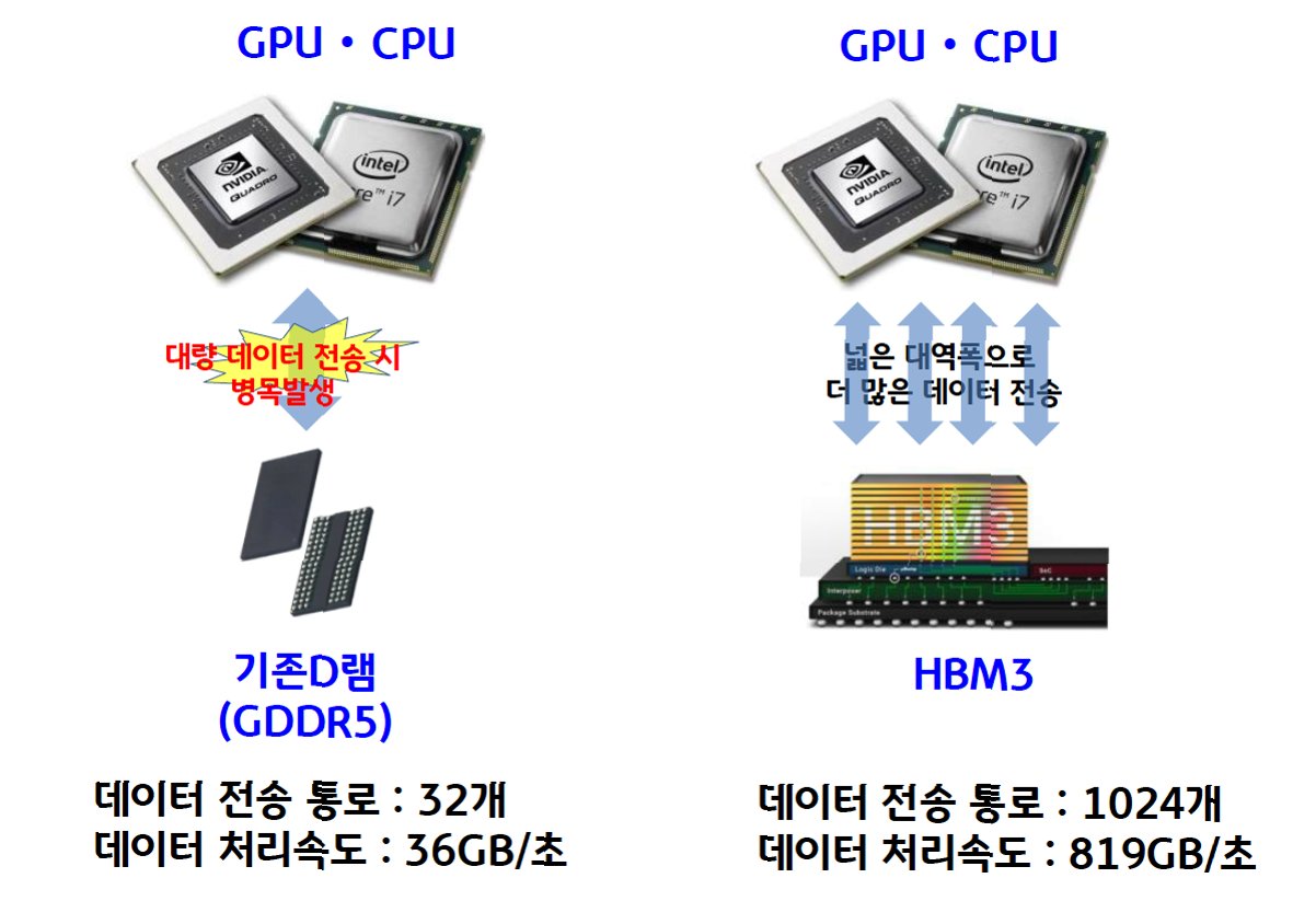 A.HBM은 GDDR 메모리에 비해 훨씬 넓은 대역폭을 제공하여, 대량의 데이터를 빠르게 처리할 수 있으며, 전력 소비 효율성도 뛰어납니다.