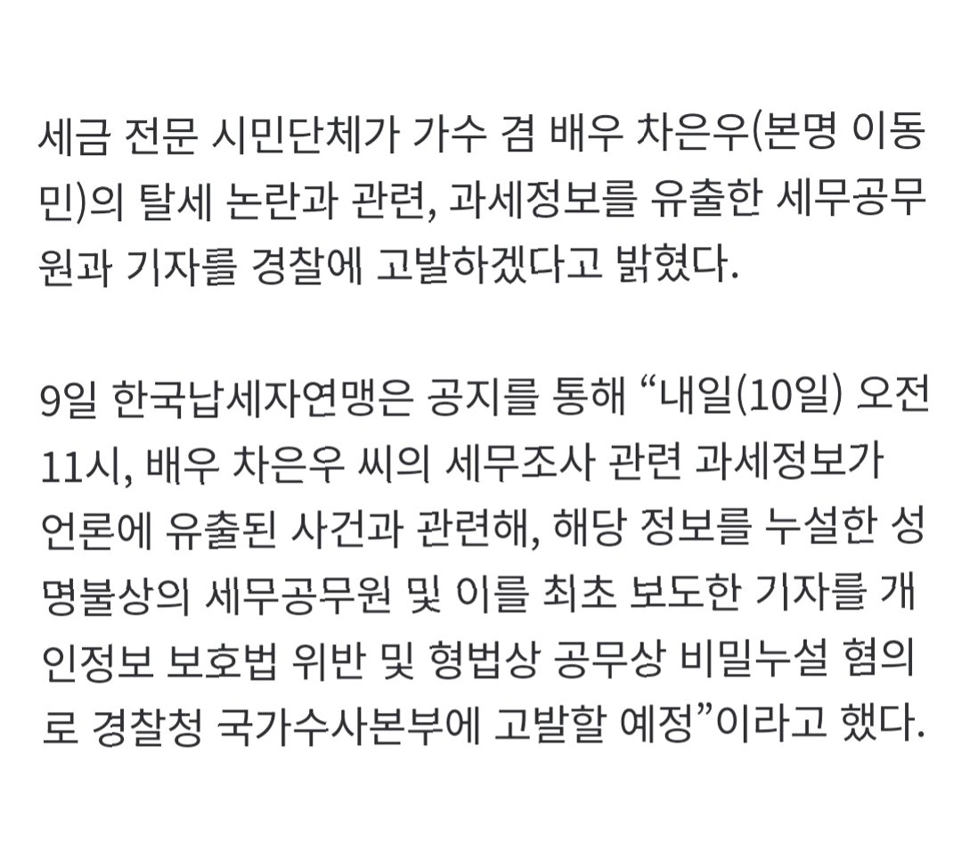 Q.한국납세자연맹은 왜 차은우 씨의 과세정보 유출에 법적 대응을 했나요?