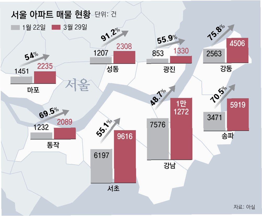 서울 아파트 매물이 감소세로 돌아섰습니다. 특히 급매물이 증가하며 가격 조정 움직임을 보였던 강남권의 분위기가 달라지고 있습니다. 한때 급증했던 매물이 소진되면서 부동산 시장이 다시 거래 절벽으로 향할 수 있다는 우려가 제기되고 있습니다. 아실에 따르면 4월 1일 기준 강남구 아파트 매물은 1만8752건으로, 일주일 전보다 10.6% 감소했습니다. 송파구와 동작구 역시 매물이 줄어든 것으로 나타났습니다.