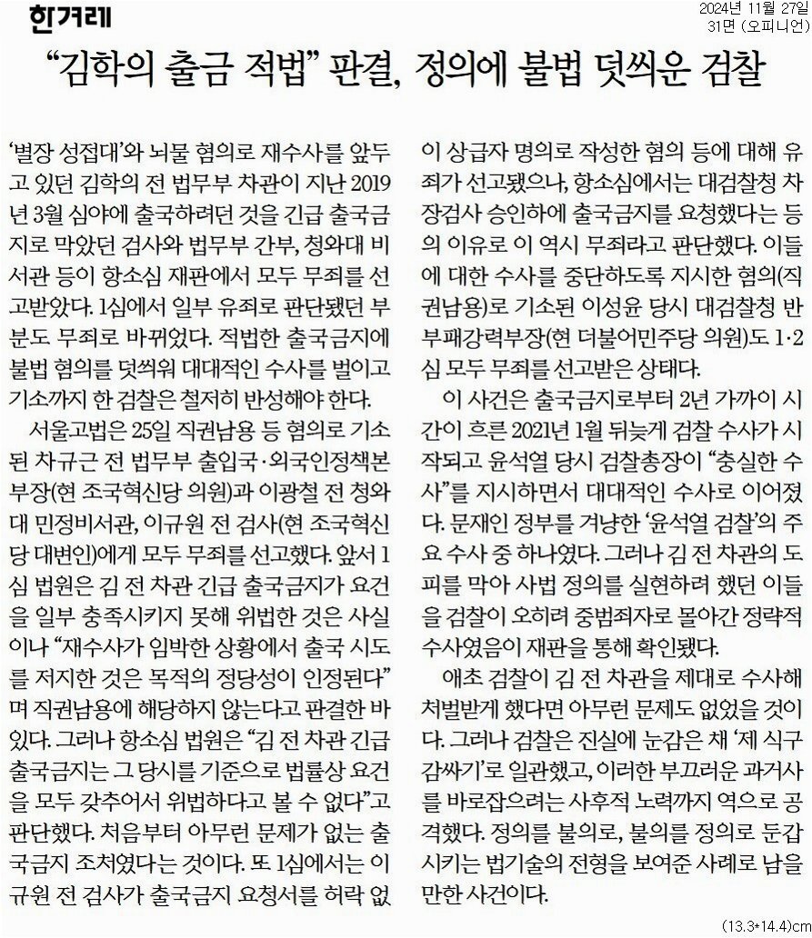 김학의 전 차관은 2019년 3월, '별장 접대 의혹'으로 인해 해외 출국을 시도하다 긴급 출국금지 조처되었습니다. 당시 대검찰청 과거사 진상조사단 소속 이규원 검사가 이 조치를 주도했습니다. 그러나 이후 검찰은 이 검사를 포함한 관련자들을 직권남용 혐의로 기소했으나, 대법원에서는 무죄가 선고되며 검찰권 남용이라는 비판이 제기되었습니다.
