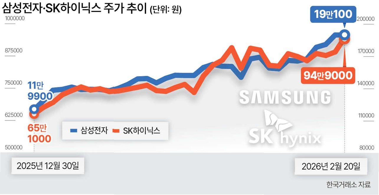 23일, 삼성전자와 SK하이닉스는 미국 대통령의 '글로벌 15% 관세' 발표라는 악재 속에서도 나란히 신고가를 기록하며 강한 상승세를 보였습니다. 삼성전자는 장중 19만 7600원, SK하이닉스는 98만원까지 오르며 역대 최고가를 경신했습니다. 비트코인 가격 하락과 같은 다른 시장의 변동성에도 불구하고, 이들 종목은 굳건한 상승세를 이어가고 있습니다. 이는 미국 연방대법원의 관세 위법 판결로 인한 뉴욕 증시의 기술주 강세가 투자 심리를 자극한 영향으로 분석됩니다.