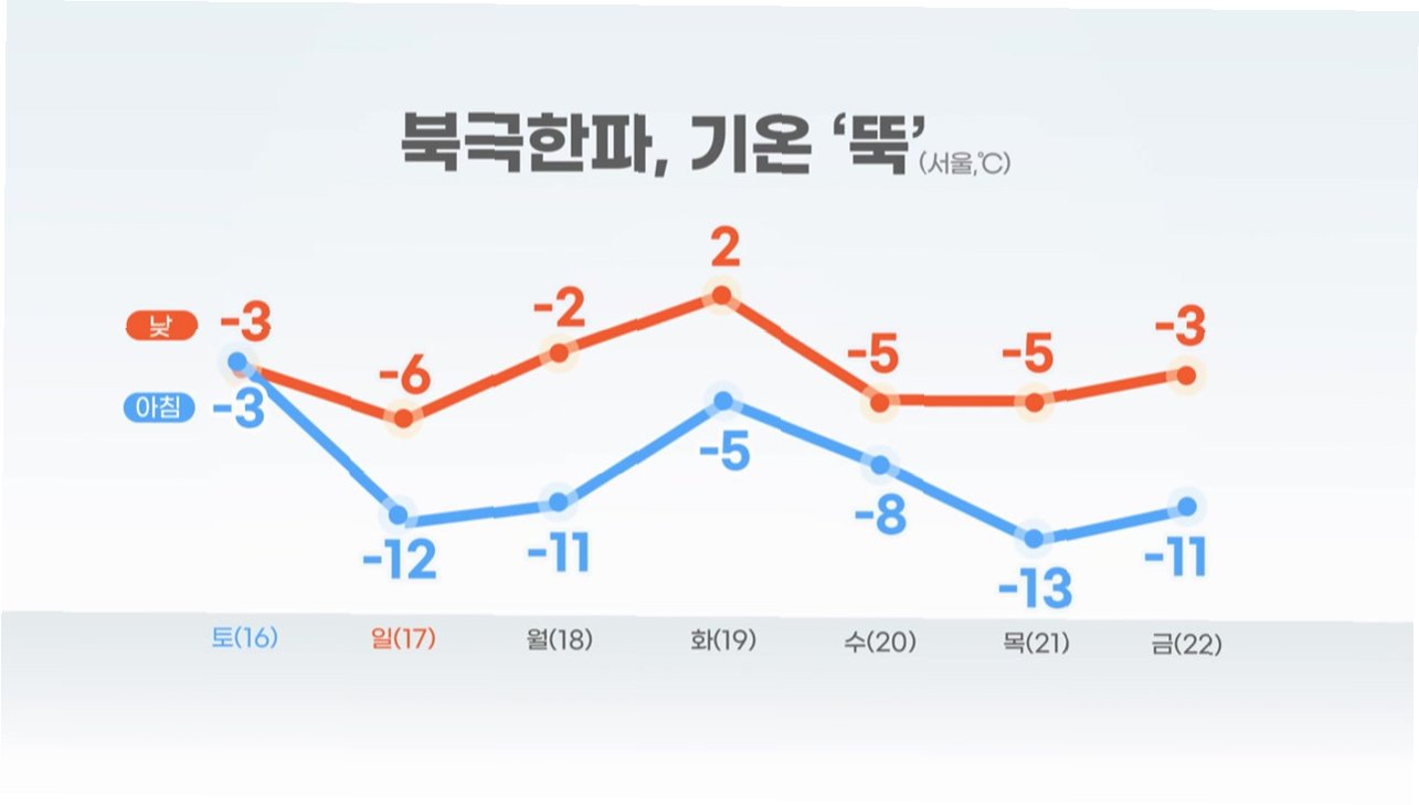 금요일인 30일은 아침 최저 기온이 영하 17도에서 영하 2도, 낮 최고 기온은 영하 4도에서 영상 6도로 오늘과 비슷하겠지만, 주말부터는 낮 기온이 영상으로 올라 포근함을 느낄 수 있겠습니다. 특히 토요일 낮 최고 기온은 영상 8도까지 오를 것으로 예상됩니다. 다만, 아침 최저 기온은 여전히 영하권에 머물러 일교차가 크겠습니다.