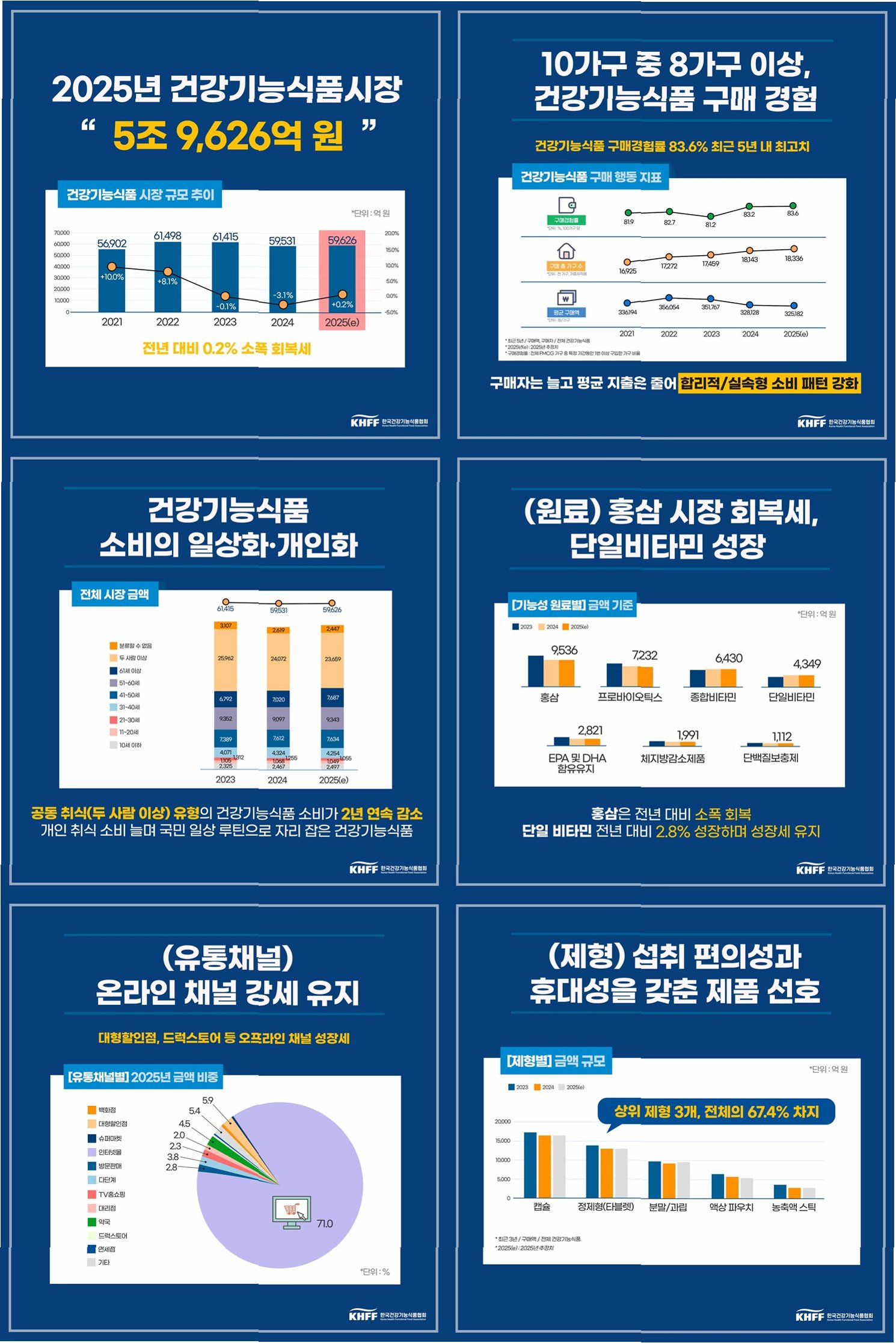 전국 성인 2000명을 대상으로 한 조사 결과, 건기식 섭취 이유로 면역력 향상(52.9%)과 피로회복(46.7%)이 가장 높게 나타났습니다. 특히 20~40대는 피로회복과 면역력에 집중하는 반면, 40대부터는 눈 건강 등 특정 부위 관리, 50~60대는 뼈·관절 및 혈당 관리 등 예방 목적이 뚜렷했습니다. 또한, 뷰티 목적의 건기식도 확장세를 보이며, 피부 탄력 개선을 위한 콜라겐, 체중 관리를 위한 유산균, 모발 관리를 위한 비오틴 등이 높은 인기를 얻고 있습니다. 이는 건기식이 연령, 성별, 고민에 따라 달라지는 '맞춤형 상품'으로 진화하고 있음을 시사합니다.