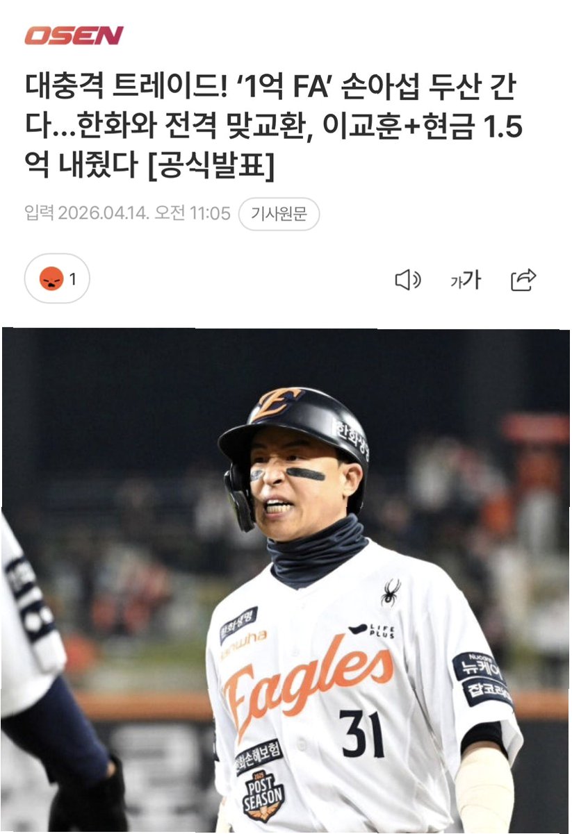두산 베어스가 타격 부진 탈출을 위해 한화 이글스의 베테랑 외야수 손아섭을 영입했습니다두산은 이교훈 투수와 현금 1억 5000만 원을 내주고 손아섭을 데려왔습니다팀 타율 최하위에 시달리던 두산은 손아섭의 경험과 승부욕으로 반등을 노리고 있습니다손아섭은 14일 SSG전부터 두산 유니폼을 입고 출격합니다.