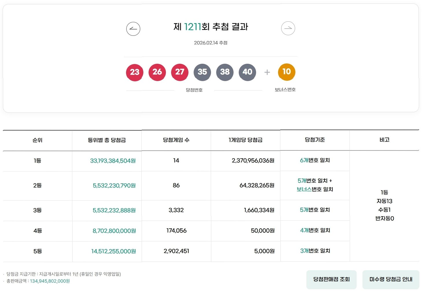 제1211회 로또 1등 당첨 번호는 23, 26, 27, 35, 38, 40이며, 보너스 번호는 10입니다. 행운의 주인공이 되신 분들께 축하의 말씀을 전합니다.