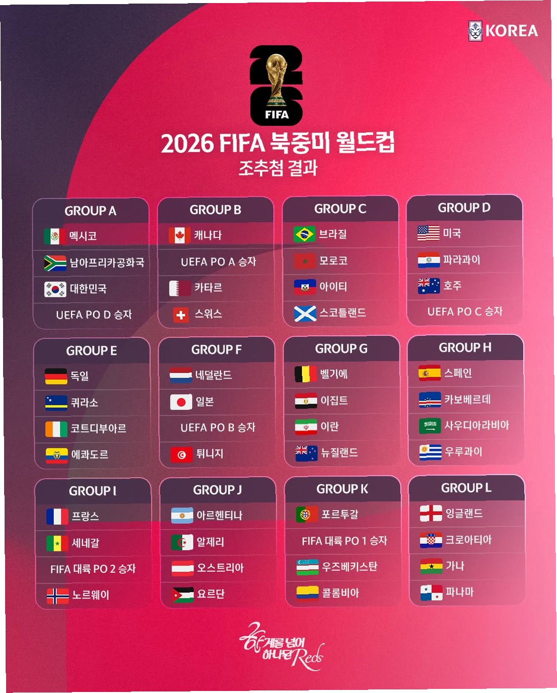 2026년 북중미월드컵이 조추첨식과 함께 본격적인 레이스에 돌입했다. 지난 6일 미국 워싱턴 DC의 케네디센터에서 열린 조추첨식에서는 추첨 결과와 함께 여러 국가의 희비가 엇갈렸다. 한국은 미소를 지었다. 역대 가장 무난한 조편성에 성공했다고 해도 과언이 아니다.