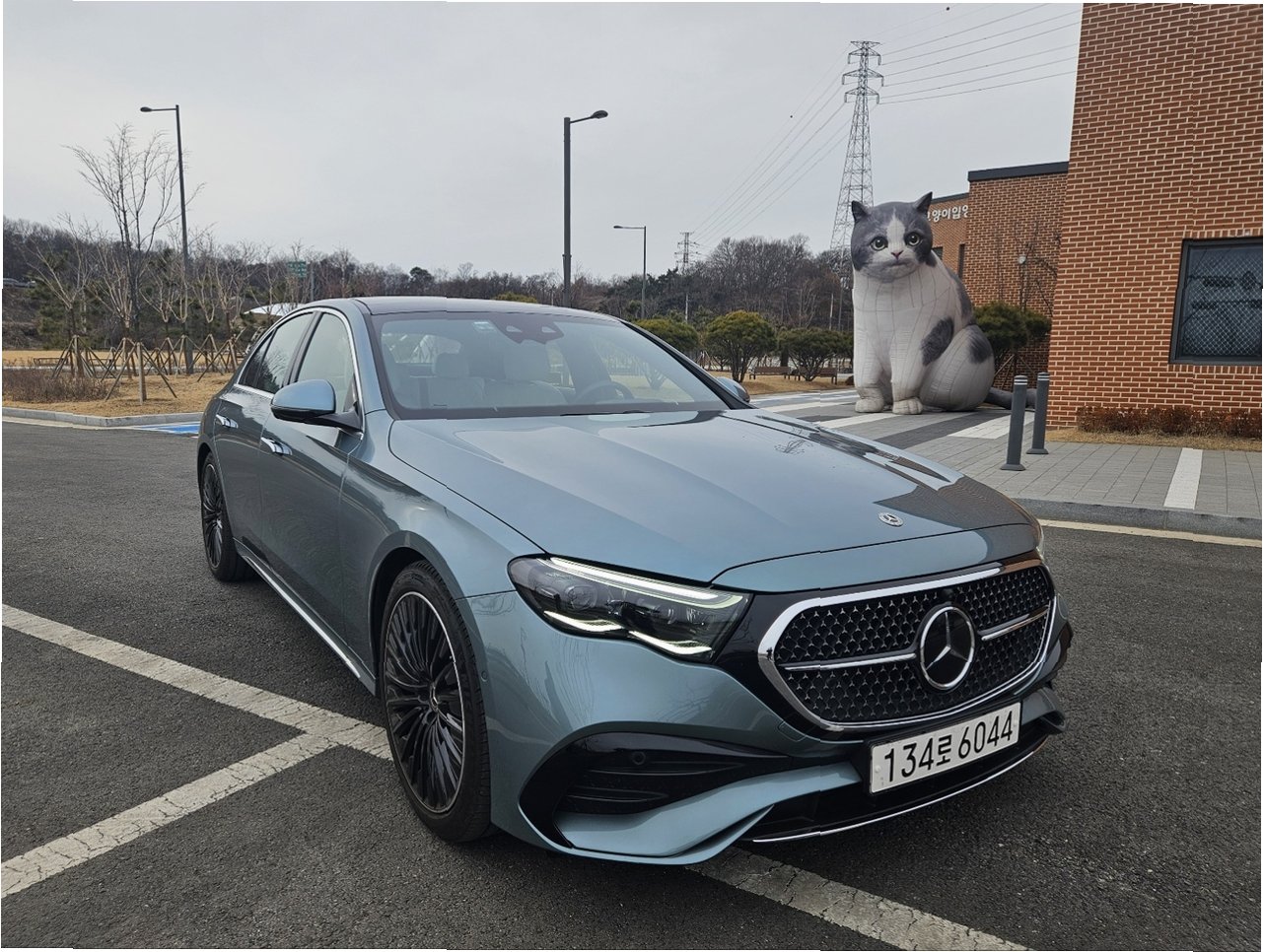 벤츠 E 300 4MATIC AMG는 길이 4955㎜, 너비 1880㎜, 높이 1465㎜의 제원으로 동급 모델인 제네시스 G80보다 약간 작은 편입니다. 전면부 라디에이터 그릴은 벤츠의 삼각별 패턴으로 촘촘하게 장식되어 있으며, 짧은 앞 범퍼부터 긴 보닛까지 이어지는 클래식 세단의 안정감 있는 비율을 자랑합니다. A필러를 눕힌 디자인은 모던한 분위기를 더하며, 리어램프에도 삼각별 패턴을 적용하여 벤츠만의 자신감을 드러냈습니다.