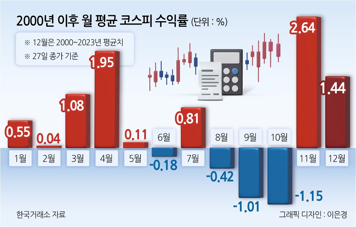 2015년, 2017년, 2021년을 제외하면, 대부분의 연도에서 1~11월의 추세가 12월에도 그대로 이어진 경향을 보였습니다. 즉, 11월까지 상승세를 보인 해는 12월에도 상승하는 경우가 많았고, 하락세를 보인 해에는 산타랠리가 나타나지 않는 경향을 보였습니다. 올해 코스피는 1~11월 동안 가파른 상승세를 기록했습니다. 지수는 1월 2일 2,398.94에서 11월 28일 3,926.59로 63.68%나 상승했으며, 월평균 상승률은 5.79%에 달합니다. 이러한 긍정적인 흐름이 12월에도 이어질 수 있을지가 관건입니다.