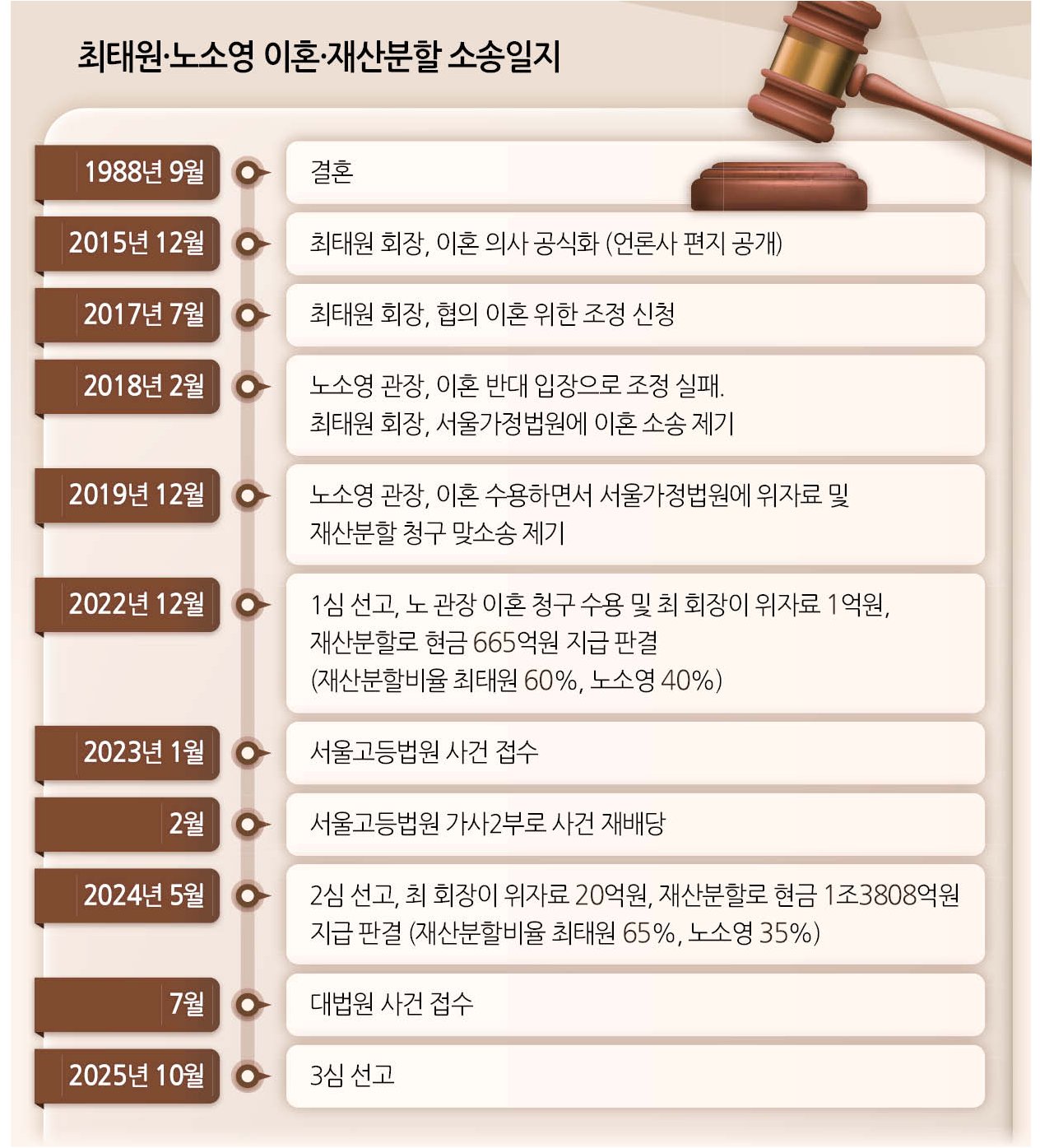 최태원 회장과 노소영 관장은 1988년 결혼하여 세 자녀를 두었지만, 2015년 최 회장이 혼외 자녀의 존재를 알리면서 파경을 맞았습니다. 2017년 최 회장은 이혼 조정을 신청했지만 합의에 이르지 못했고, 결국 정식 소송으로 이어졌습니다. 노 관장은 2019년 이혼에 응하겠다며 맞소송을 냈습니다. 위자료 20억 원에 대해서는 대법원이 원심 판단을 유지하며 상고를 기각했습니다.