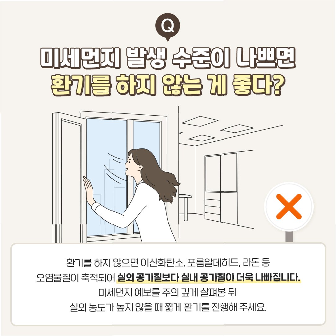 A.하루 2~3회, 30분 이상 창문을 열어 환기합니다. 미세먼지 농도가 높은 날에는 공기청정기를 사용하는 것이 좋습니다.