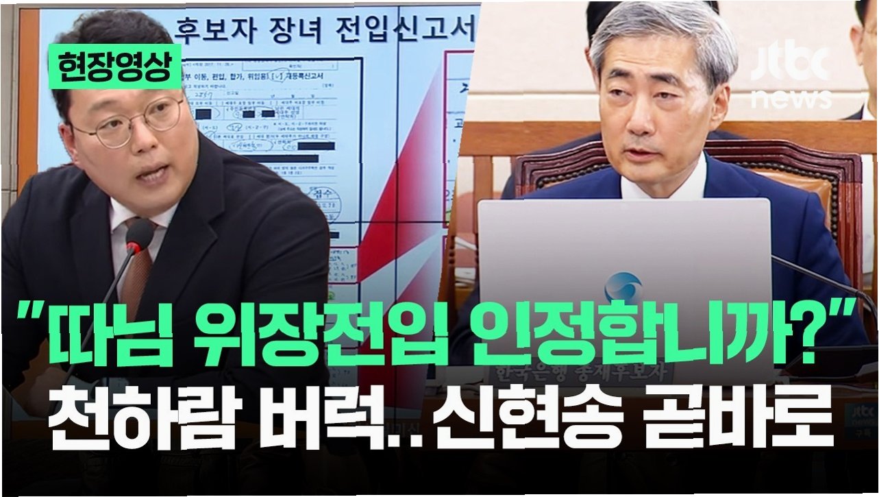 신현송 한국은행 총재 후보자가 장녀의 위장전입 의혹에 대해 '후회된다. 잘못했다'고 시인했습니다. 개혁신당 천하람 의원은 신 후보자가 영국 국적인 딸을 내국인으로 위장 전입 신고한 것이 주민등록법 위반 소지가 있다고 지적했습니다. 이는 고위공직자 후보자로서 대표적인 결격 사유에 해당한다는 비판이 제기되었습니다.