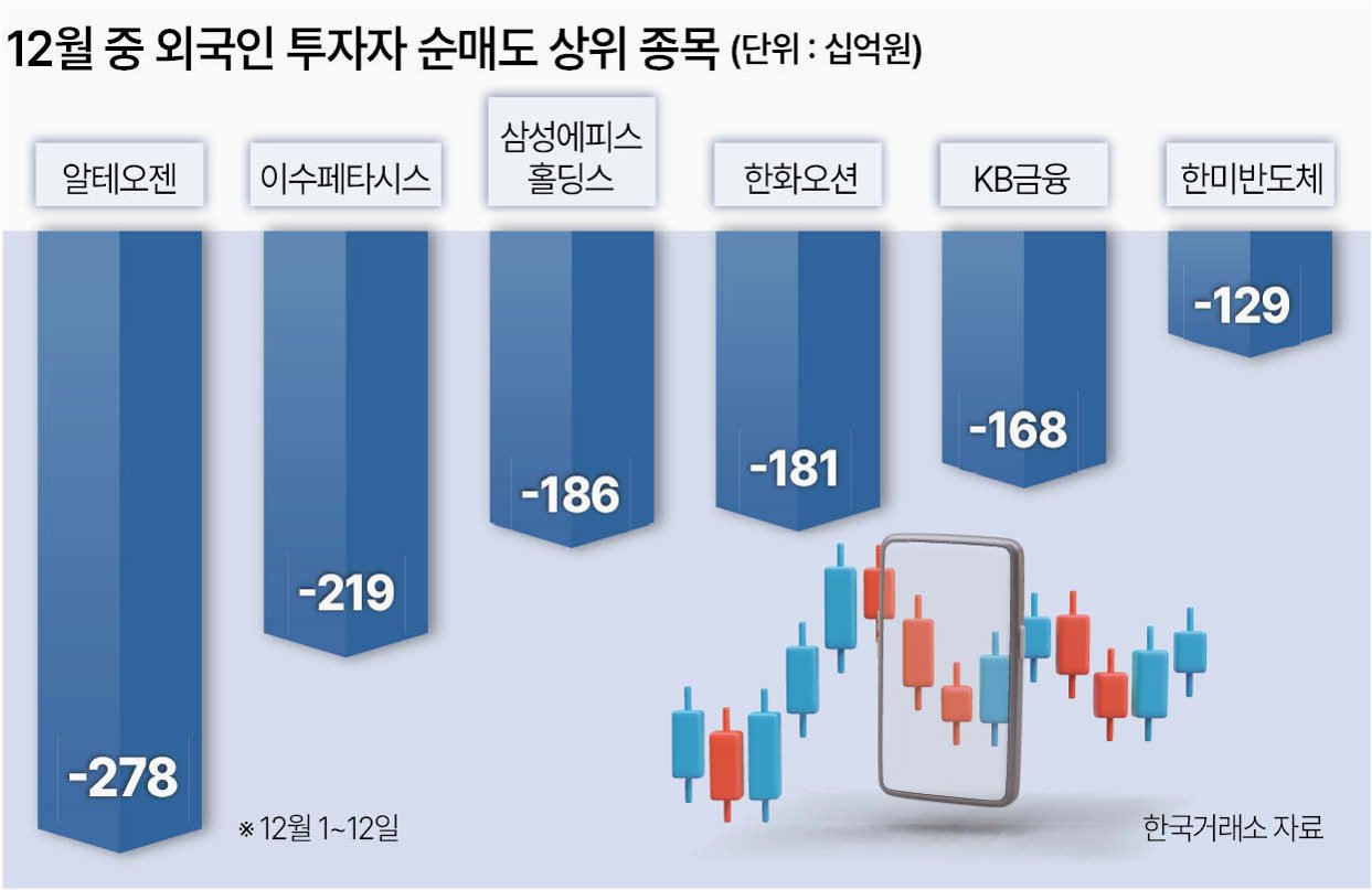 외국인의 순매도세는 삼성전자에 유독 집중되었습니다올해 들어 무려 59%나 급등했던 삼성전자에 대해 외국인은 9조 5540억 원에 달하는 막대한 규모의 순매도를 기록했습니다. 삼성전자 외에도 SK하이닉스(5조 9720억 원), 현대자동차(5조 2940억 원) 등 대형주들이 외국인의 매도 대상에 올랐습니다. 시장 전문가들은 이러한 현상을 두고 코스피 지수가 연초 대비 38% 급등한 상황에서 외국인 투자자들이 차익 실현에 나선 것으로 분석하고 있습니다. 높은 수익률을 달성한 종목들을 중심으로 매도하며 현금화에 나선 것으로 풀이됩니다.