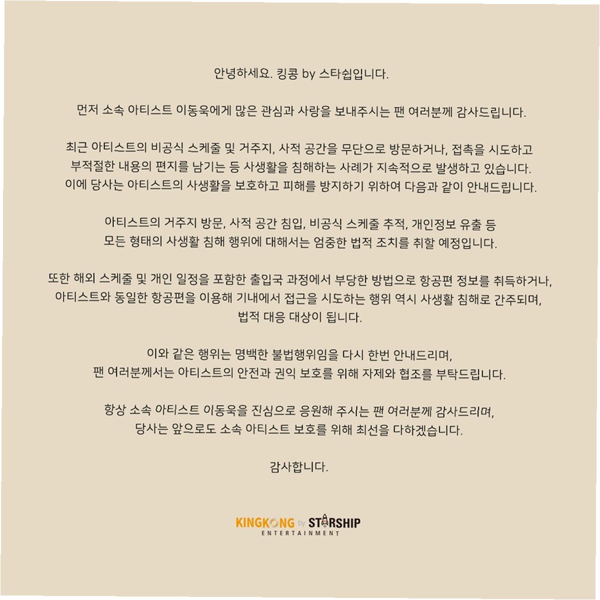 배우 이동욱의 소속사 킹콩 by 스타쉽이 도를 넘은 사생활 침해 행위에 대해 강력하게 대응할 것을 공식적으로 발표했습니다. 최근 이동욱의 비공식 스케줄, 거주지, 사적 공간에 대한 무단 방문 및 접촉 시도, 부적절한 내용의 편지 발송 등 사생활 침해 사례가 끊이지 않고 발생하고 있기 때문입니다. 이에 소속사는 아티스트의 안전과 권익 보호를 위해 엄중한 법적 조치를 취할 것을 밝혔습니다.