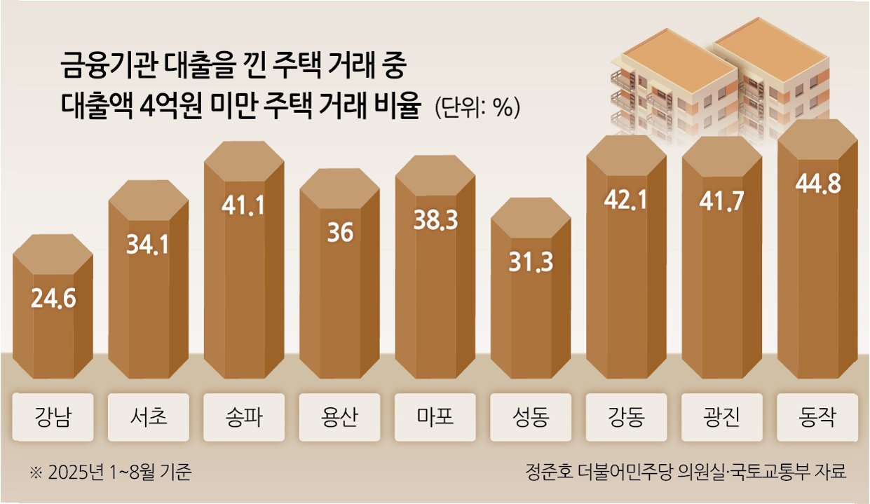 4억 이상 대출 비중이 높은 지역을 살펴보면, 강남구가 75%로 가장 높았고, 성동구(68%), 양천구(66%), 서초구(65%), 용산구(64%), 영등포구(63%) 순으로 나타났습니다. 이른바 '강남 3구'와 용산, 성동 등 인기 지역일수록 4억원 초과 대출 의존도가 높다는 것은, 이 지역의 높은 주택 가격과 무관하지 않습니다. 이는 곧, 주택담보대출 규제가 강화될수록 이러한 지역의 내 집 마련은 더욱 어려워질 것이라는 점을 시사합니다. 특히, 강남 지역은 높은 주택 가격으로 인해 4억 원 대출 제한이 더욱 치명적으로 작용할 수 있습니다.