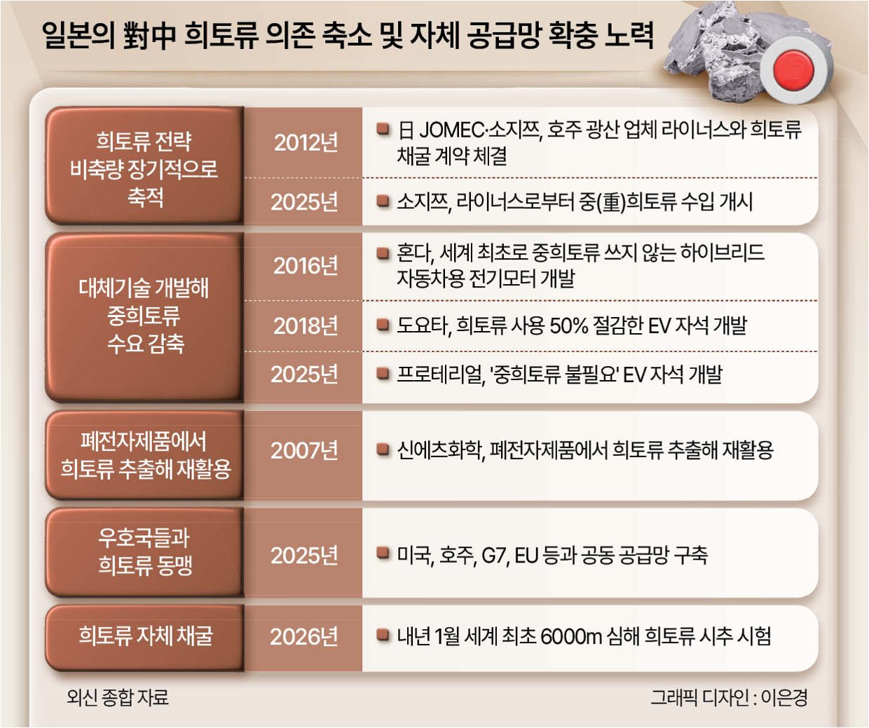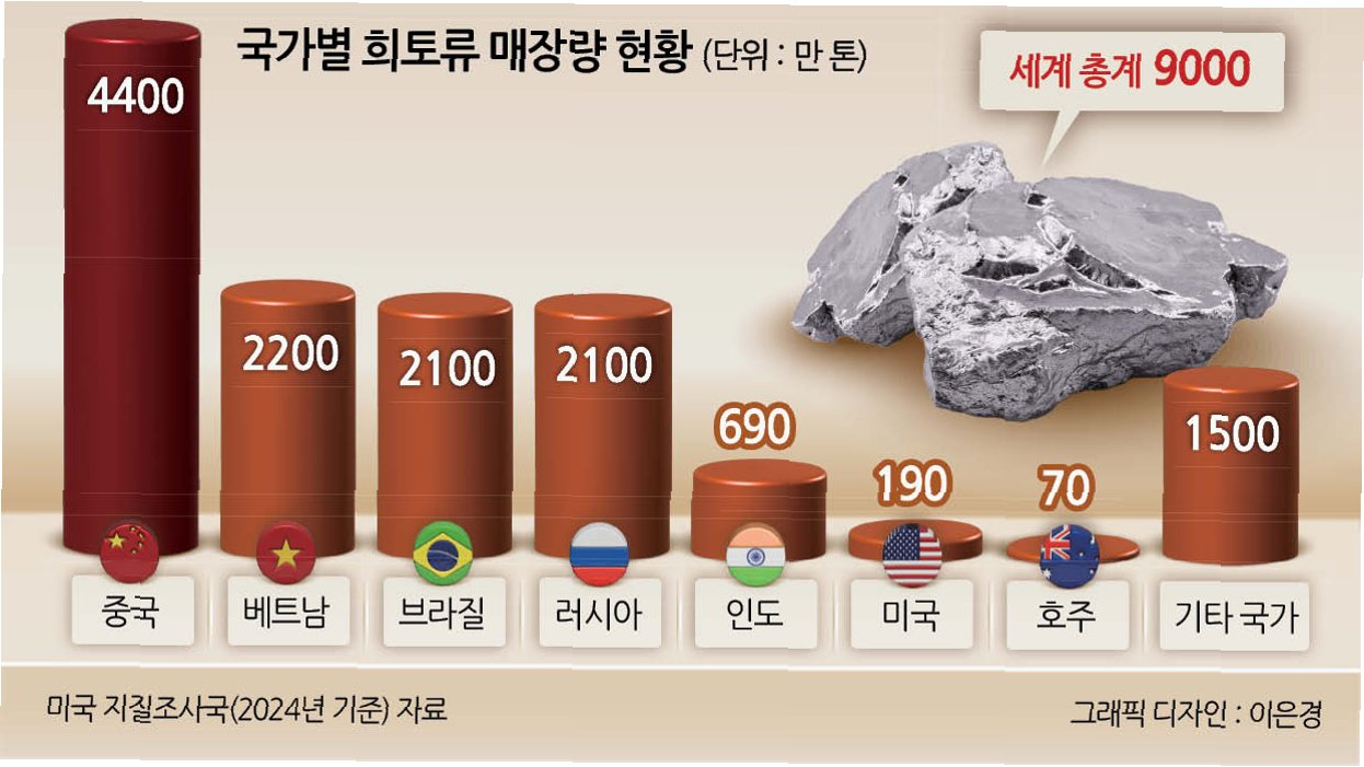 중국은 일본 제조업의 핵심인 전기차, 반도체, 배터리, 카메라 등 주력 품목 생산에 필수적인 희토류 및 전략 광물에 대한 수출 통제를 강화해 왔습니다. 일본은 공급망 다변화를 시도했지만, 여전히 중국산 희토류 의존도가 높은 상황입니다.