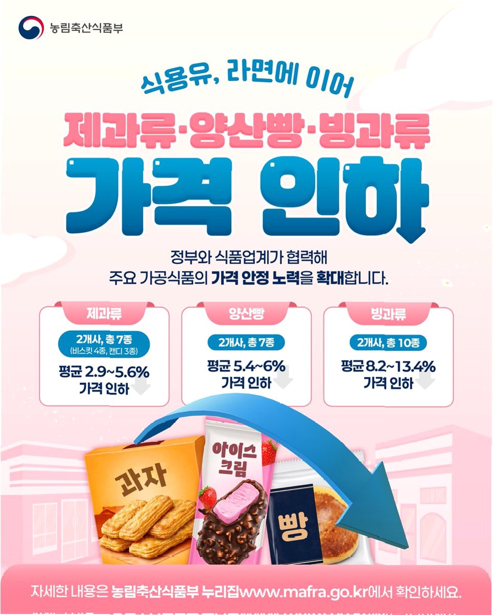 A.이번 가격 인하는 주로 과자, 빵, 라면, 식용유 등 일부 가공식품에 해당됩니다. 모든 식품의 가격이 일괄적으로 인하되는 것은 아닙니다.