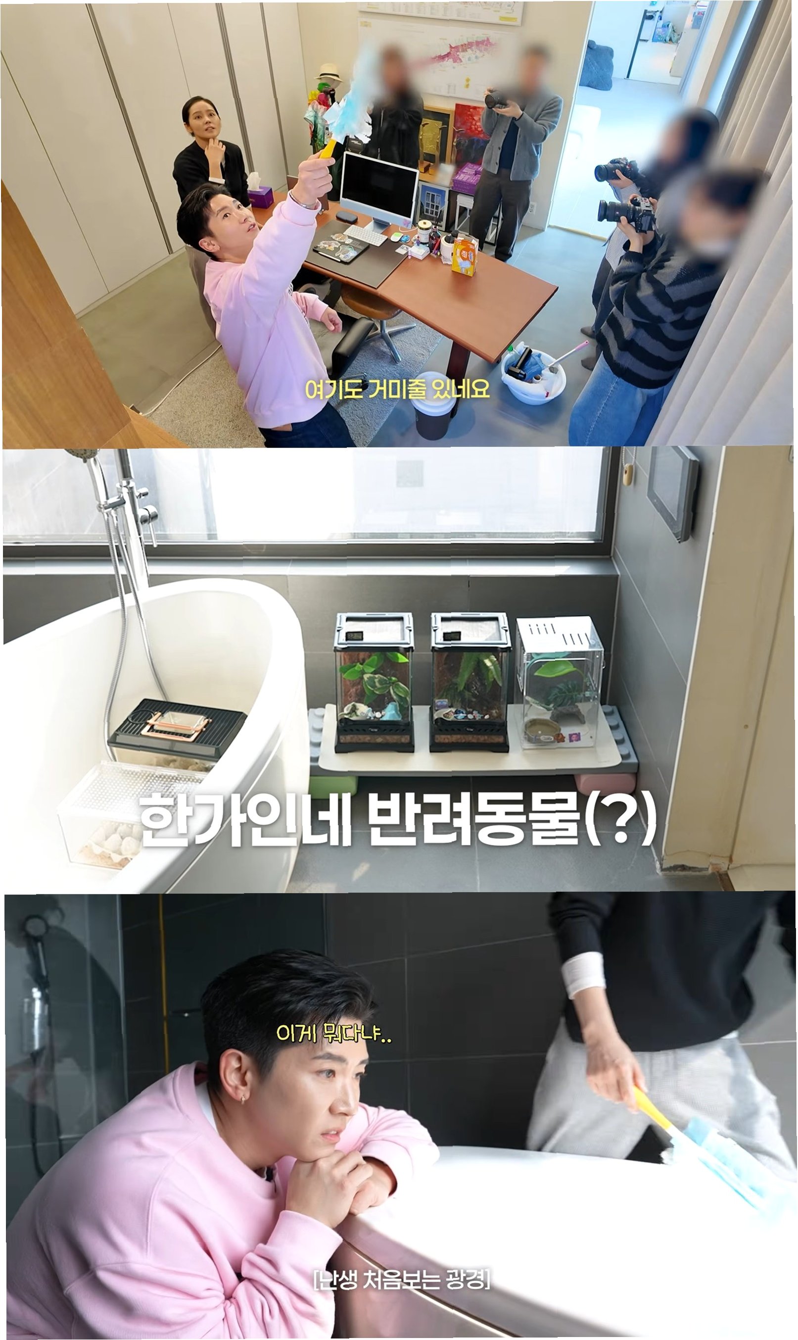 브라이언은 한가인의 집 욕실 욕조를 보고 충격을 금치 못했습니다. 욕조 안에는 도마뱀 두 마리와 개구리 한 마리, 그리고 이들의 먹이로 추정되는 귀뚜라미 약 100마리가 함께 사육되고 있었습니다. 한가인은 겨울철 추위를 피해 거실에 있던 귀뚜라미들을 욕조로 옮겼다고 설명했습니다. 브라이언은 이러한 광경에 비명을 지르며 당황했지만, 이내 웃음바다가 되었습니다.