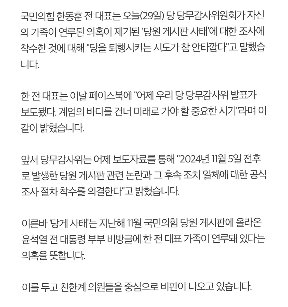 국민의힘은 '당원 게시판(당게) 사태'와 관련하여 한동훈 전 대표 가족과 이름이 같은 게시물 작성자들의 신원을 확인하는 절차를 진행 중이라고 밝혔습니다. 이 사태는 지난해 11월 국민의힘 당원 게시판에 윤석열 전 대통령 부부 비방글에 한 전 대표 가족이 연루됐다는 의혹에서 비롯되었습니다. 이번 조사는 해당 의혹의 진위를 파악하고, 관련된 모든 사실 관계를 명확히 밝히기 위한 첫걸음으로 보입니다.