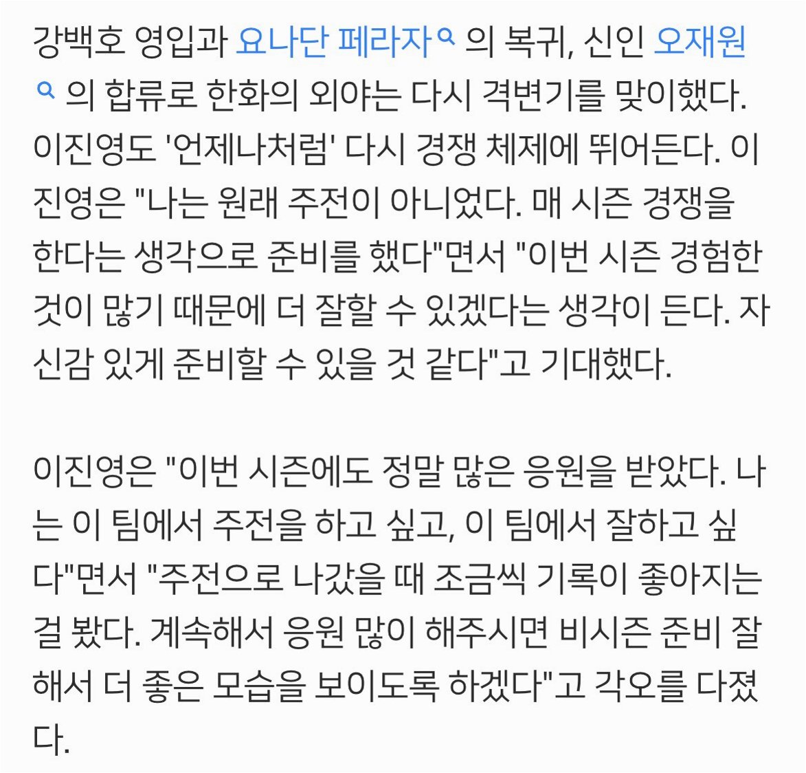 강백호 선수 영입, 요나단 페라자 선수의 복귀, 신인 오재원 선수의 합류로 한화 외야는 다시 한번 치열한 경쟁을 예고했습니다. 이진영 선수는 “나는 원래 주전이 아니었다. 매 시즌 경쟁을 한다는 생각으로 준비를 했다”고 말하며, 긍정적인 자세를 보였습니다. 그는 이번 시즌 경험을 바탕으로 더 좋은 모습을 보여주겠다는 자신감을 드러냈습니다.