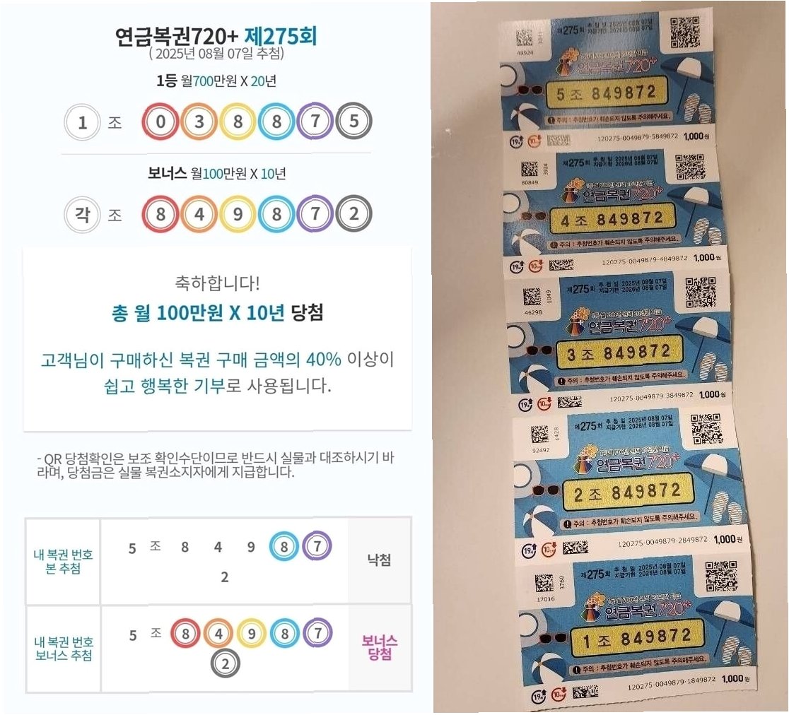 평소 연금복권을 세트로 구매하던 A씨는 어느 날 문득 멀리 보이는 복권 판매점을 보고 연금복권이 떠올랐다고 합니다. 매장에 들어선 A씨는 특히 눈에 띄는 번호 배열에 이끌려 로또와 함께 연금복권을 세트로 구매했습니다. 며칠 뒤 당첨 번호를 확인했을 때, 익숙한 숫자들이 하나둘 보이기 시작하더니 놀랍게도 1등에 당첨되는 영광을 안았습니다. 이 소식을 들은 딸은 마치 자신의 일처럼 기뻐하며 축하를 건넸습니다.