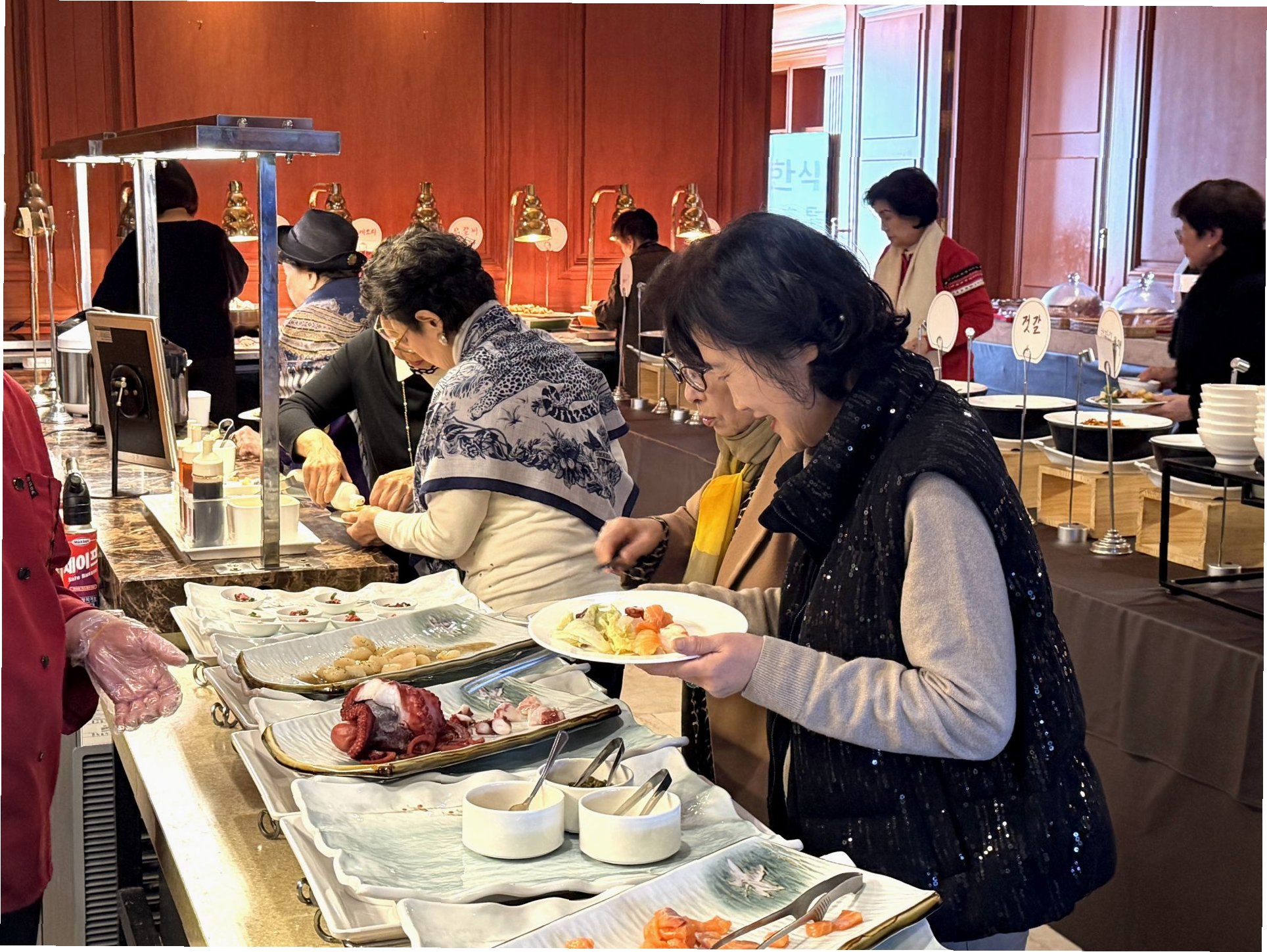 화사한 스카프와 소녀 같은 웃음, 호텔 뷔페의 새로운 손님들