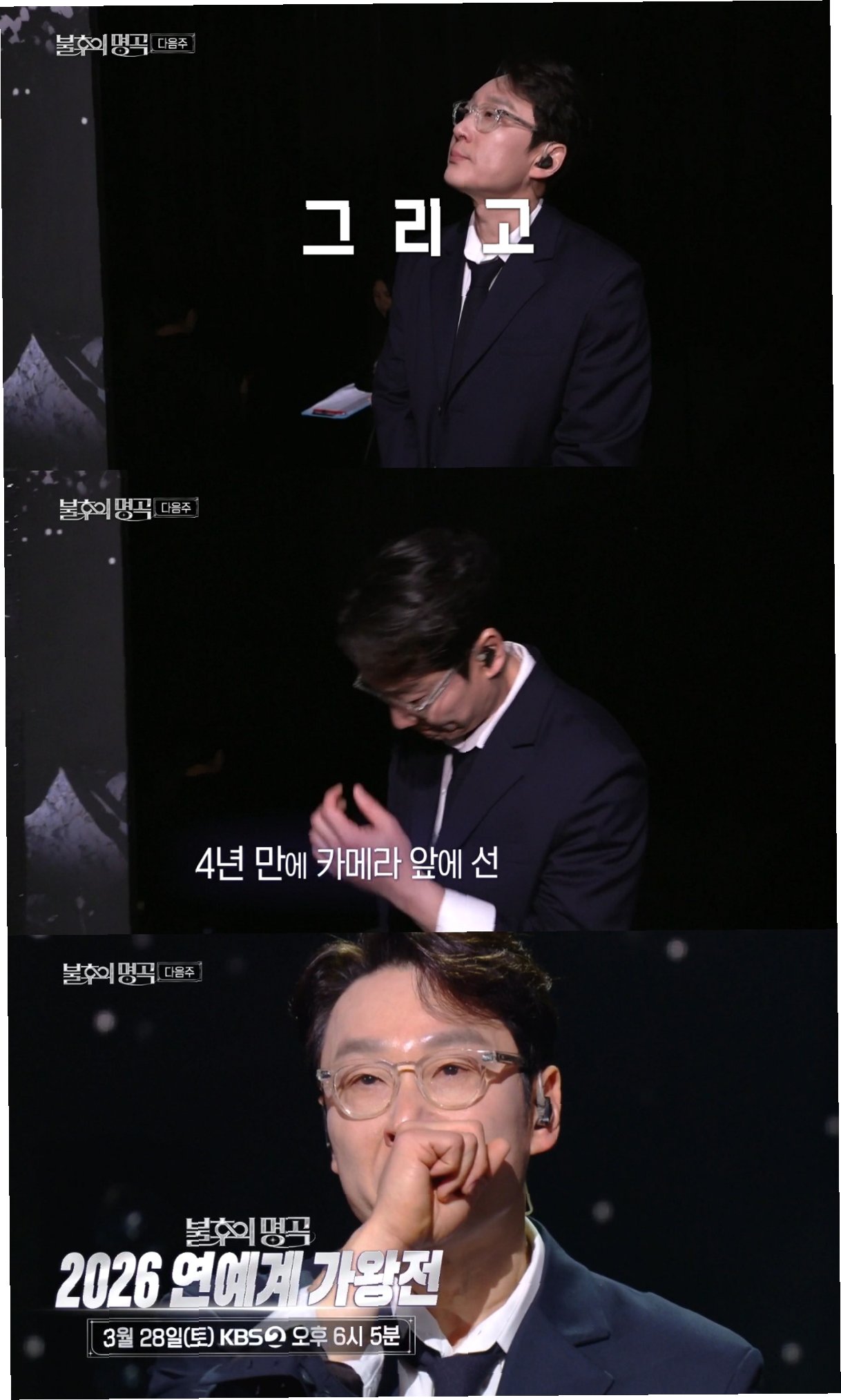 방송인 이휘재가 약 4년 만에 방송 복귀를 알렸습니다. 지난 21일 KBS2 '불후의 명곡' 예고편에서 그는 무대에 올라 "오랜만에 인사드리게 됐다. 이휘재다"라고 말하며 눈시울을 붉혔습니다. 오는 28일과 다음 달 4일, 총 2회에 걸쳐 방송될 '2026 연예계 가왕전' 특집에 출연하는 이휘재는 녹화 현장에서 최호섭의 '세월이 가면'을 부르다 감정에 복받쳐 오열하는 모습을 보이기도 했습니다. 그는 매니저나 가족 없이 홀로 녹화에 참여하며 조용히 일정을 소화했습니다.