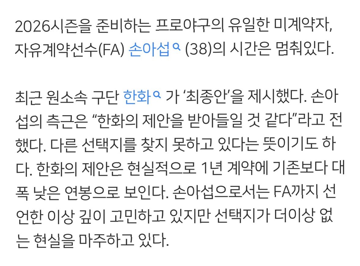 프로야구 시즌을 앞두고 유일한 미계약 FA 선수인 손아섭의 거취가 불투명합니다. 원소속팀 한화 이글스가 최종 제안을 했지만, 손아섭 측은 다른 선택지를 찾지 못하고 고심 중입니다. 한화의 제안은 1년 계약에 연봉 대폭 삭감 조건으로 알려졌습니다. FA 선언 후에도 현실적인 선택지가 좁아진 상황에 놓였습니다.