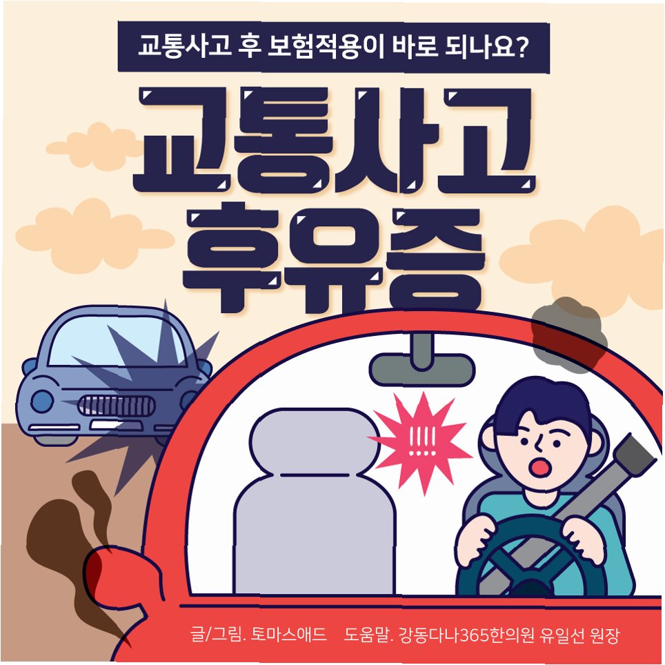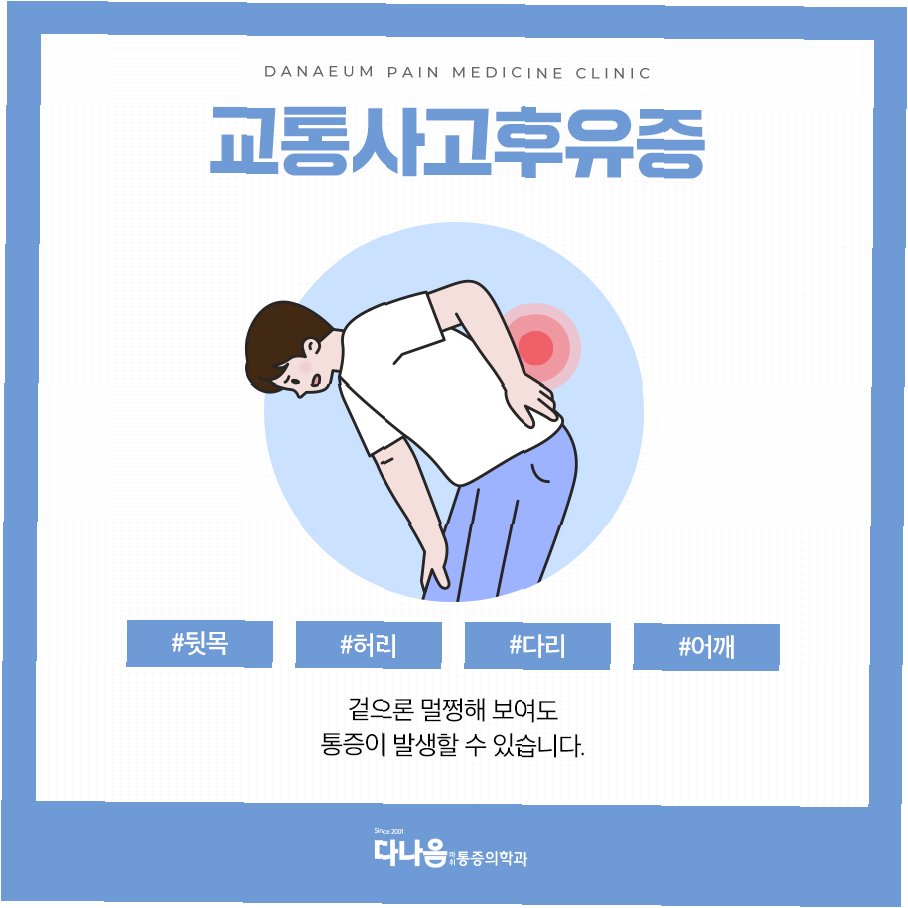 교통사고 후 별다른 외상이 없고 검사상 '정상'이지만 온몸이 아픈 경우가 많습니다. 사고 직후에는 우리 몸이 통증을 줄이는 엔도르핀과 스트레스 관리 호르몬인 아드레날린을 분비하여 통증을 덜 느끼게 합니다. 하지만 하루가 지나 호르몬 분비가 줄고 염증 반응이 본격화되면 근육 경직과 함께 통증이 심해질 수 있습니다. 따라서 사고 후 며칠간은 몸 상태를 주의 깊게 지켜보는 것이 중요합니다. 기상 변화에 따른 통증 역시 기압 저하로 관절 내부 압력이 높아지고 근육 및 인대로 가는 산소 공급이 줄어 신경이 자극받기 때문입니다.