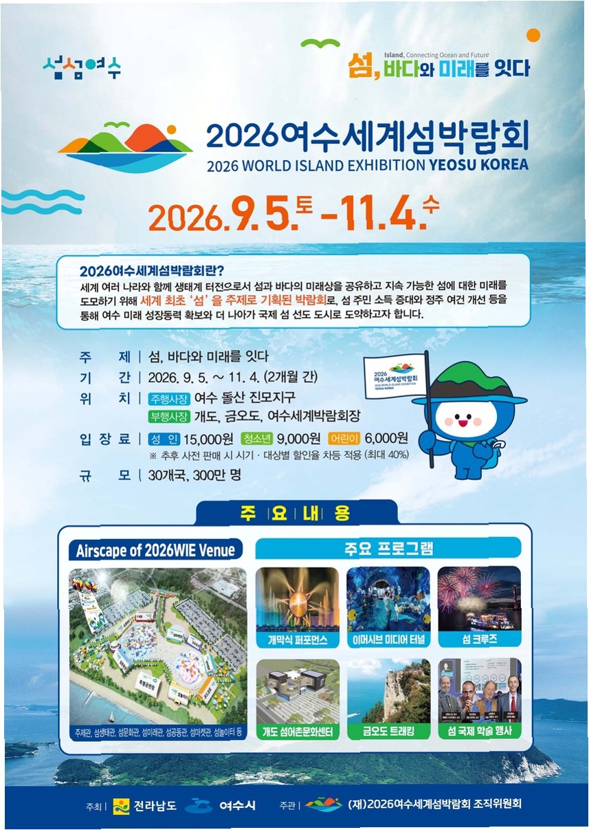 전남도와 여수시가 참여한 조직위원회는 이번 중앙 정부의 지원을 재정 및 인프라 한계 극복의 기회로 삼고 있습니다. 특히 행사 기간 여수공항의 국제선 부정기 운항을 건의하는 등 실질적인 성공 개최를 위한 다각적인 노력을 기울이고 있습니다. 2026 여수 세계 섬박람회는 오는 9월 5일부터 11월 4일까지 여수 일대에서 개최됩니다.
