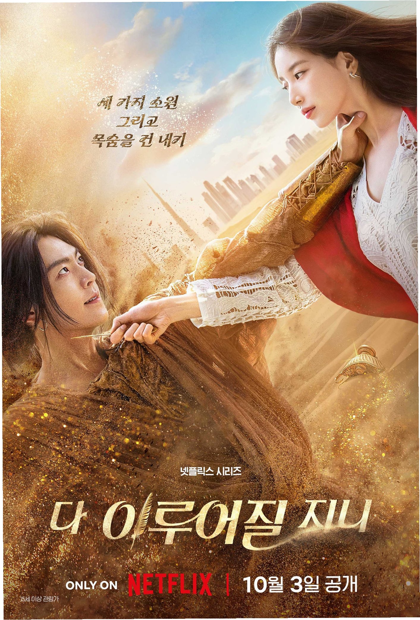 '다 이루어질지니'는 천 년 만에 깨어난 램프의 정령 지니(김우빈)와 감정을 잃어버린 인간 가영(수지)이 세 가지 소원을 두고 벌이는 판타지 로맨틱 코미디입니다. 김은숙 작가의 신작이자 김우빈, 수지의 9년 만의 재회로 많은 기대를 모았습니다.