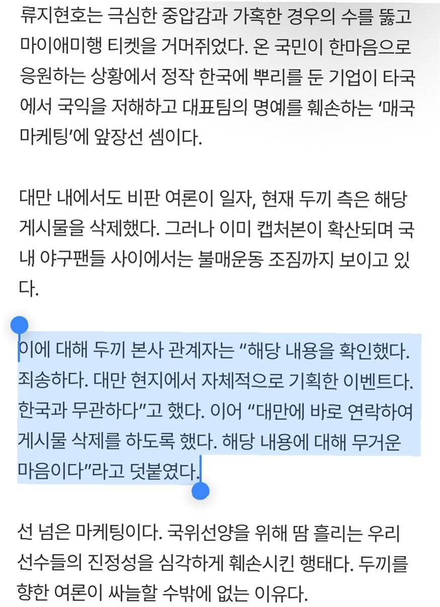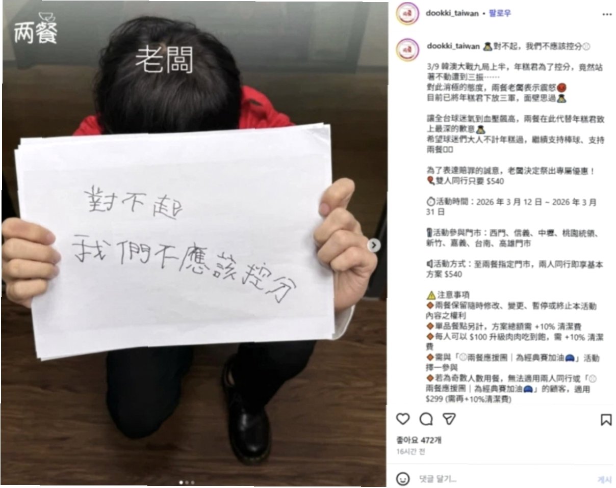 대만 내에서도 비판 여론이 일자 두끼 측은 해당 게시물을 삭제했지만, 이미 캡처본이 확산되며 국내 야구팬들 사이에서는 불매 운동 조짐까지 보이고 있습니다. 이에 대해 두끼 본사 관계자는 '대만 현지에서 자체 기획한 이벤트로 한국과는 무관하다'고 해명하며 사태 수습에 나섰지만, 이미 실추된 이미지는 회복하기 어려워 보입니다.