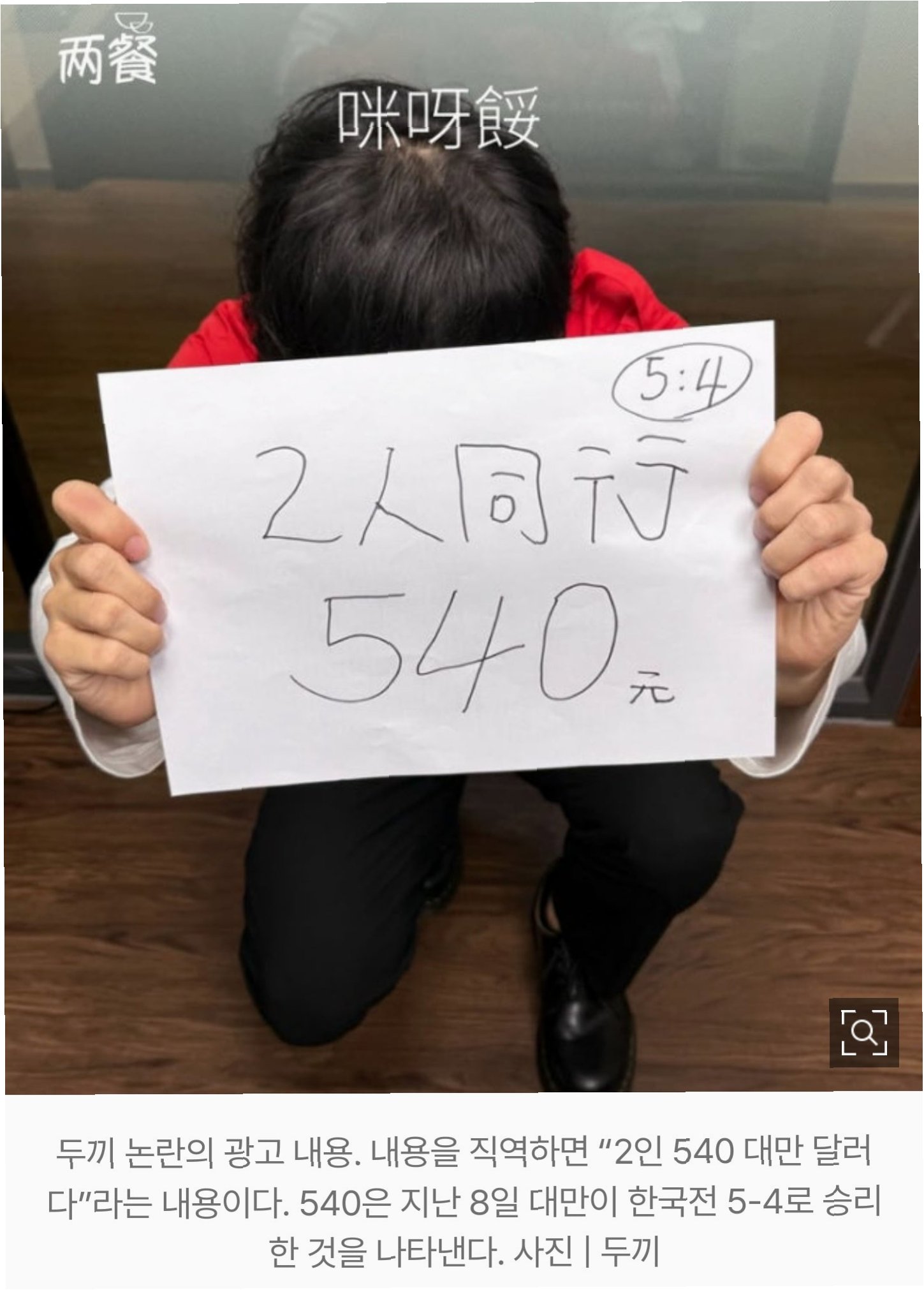 A.대만 두끼는 한국 야구 대표팀이 '점수 조작'을 했다는 내용과 함께 무릎 꿇고 사죄하는 이미지를 사용한 홍보물을 게시했습니다. 이는 한국이 대만에 4-5로 패배한 점수를 이용한 것으로 해석됩니다.
