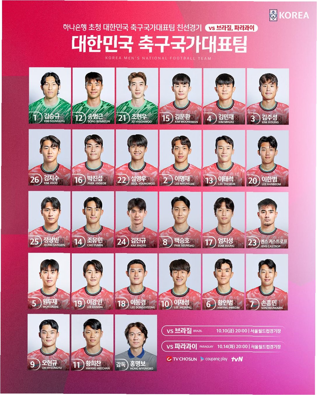 손흥민 7번, 이강인 19번, 이재성 10번 등 주요 선수들의 등번호가 확정된 가운데, 대표팀은 유럽 원정 2연전을 통해 북중미 월드컵을 향한 최종 점검에 나섭니다. 특히 수비수로 발탁된 옌스 카스트로프의 활약 여부가 주목됩니다.
