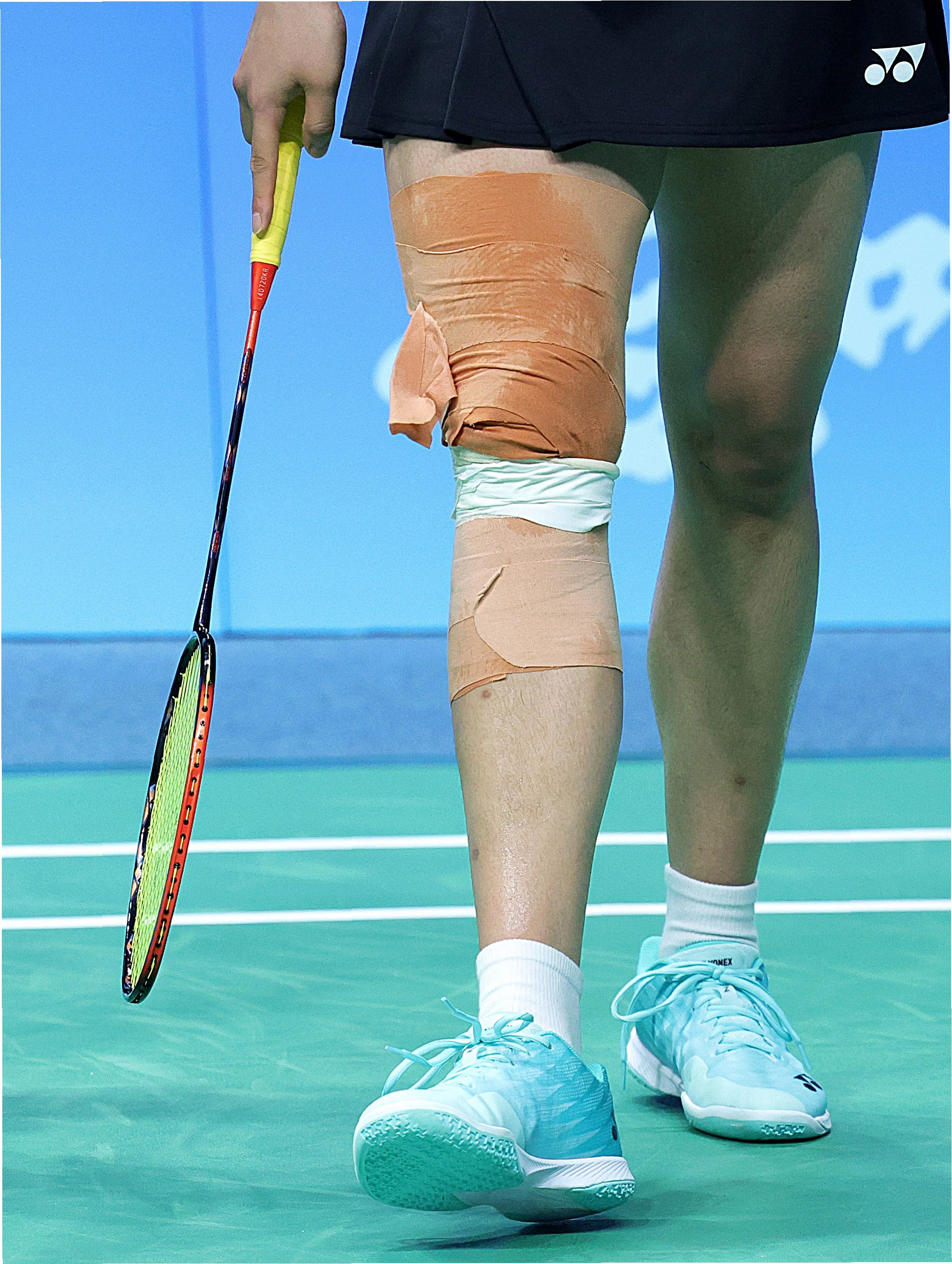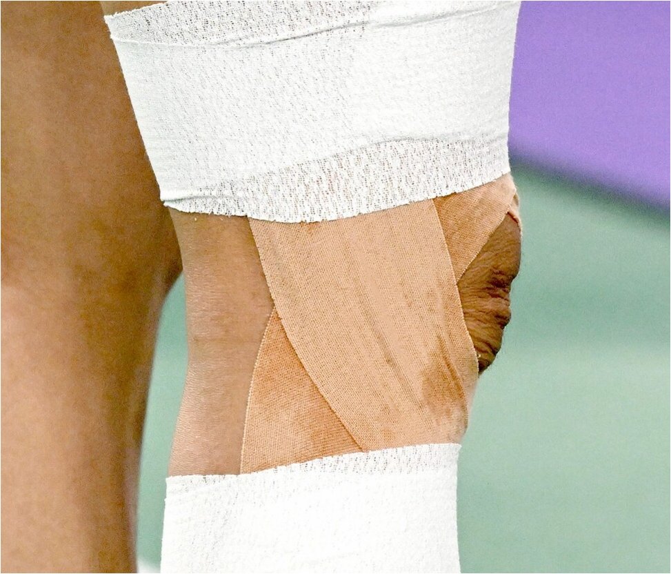 A.최근 연이은 대회 출전과 훈련으로 체력 소모가 극심한 상황이며, 공개된 사진에서 오른쪽 무릎에 두꺼운 아이싱과 붕대를 하고 있는 모습이 포착되어 팬들의 걱정을 사고 있습니다.