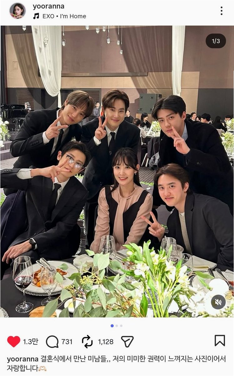 그룹 엑소 멤버 찬열의 친누나이자 전 아나운서인 박유라 씨가 수호의 친형 결혼식에 참석해 엑소 멤버들과 함께 찍은 사진을 공개했습니다. 박 씨는 자신의 SNS에 '결혼식에서 만난 미남들. 저의 미미한 권력이 느껴지는 사진이어서 자랑합니다'라는 글과 함께 카이, 수호, 세훈, 찬열, 디오와 함께 찍은 사진을 게재하며 팬들의 이목을 집중시켰습니다. 사진 속 박유라 씨는 엑소 멤버들에게 둘러싸여 환한 미소를 짓고 있어 훈훈함을 더했습니다.