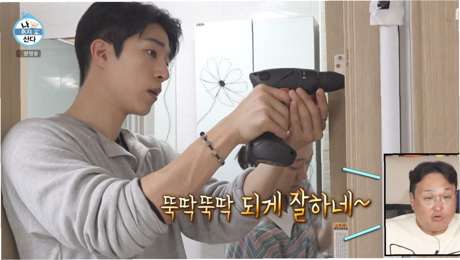이찬형의 진가는 박경혜의 셀프 인테리어 현장에서 더욱 빛났습니다. 기포가 생겨 울퉁불퉁해진 싱크대 시트지를 보고 망설임 없이 작업에 나선 그는, 능숙한 가위질과 섬세한 손길로 시트지를 깔끔하게 붙여나갔습니다. 또한, 녹슨 화장실 문고리와 경첩까지 직접 교체하며 '금손' 면모를 제대로 보여주었습니다. 커튼 설치부터 각종 수리까지 척척 해내는 그의 활약에 박경혜는 연신 감탄을 쏟아냈습니다.