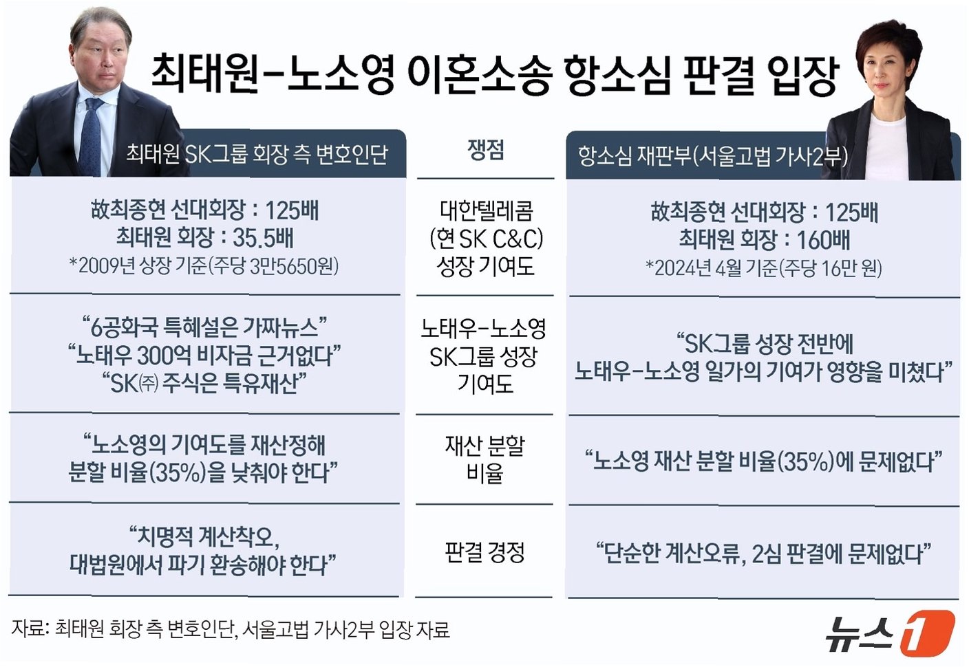 최 회장과 노 관장은 1988년 결혼하여 슬하에 세 자녀를 두었으나 파경을 맞았습니다. 2017년 최 회장이 이혼 조정을 신청했으나 결렬되었고, 이후 정식 소송으로 이어졌습니다. 1심에서는 최 회장이 노 관장에게 위자료 1억 원과 재산분할 665억 원을 지급하라고 판결했습니다. 하지만 2심에서는 위자료 20억 원, 재산분할 1조 3,808억 원으로 금액이 대폭 늘어났습니다. 이는 최 회장이 보유한 SK 지분을 분할 대상에 포함시킨 결과였습니다. 그러나 대법원은 2심의 재산분할 판단을 파기하고 사건을 서울고법으로 돌려보냈습니다. 대법원은 노태우 전 대통령의 비자금 300억 원은 불법적인 자금으로 재산 분할에 참작할 수 없다고 판단했습니다. 다만, 위자료 20억 원 인정 부분은 상고를 기각하여 확정되었습니다.