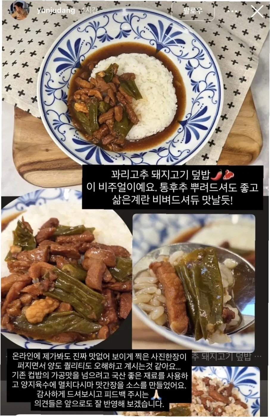 논란이 확산되자 윤주모 셰프는 자신의 SNS를 통해 직접 해명에 나섰습니다. 그는 덮밥 제품을 직접 플레이팅한 사진을 공개하며 '꽈리고추 돼지고기 덮밥은 이런 비주얼'이라고 소개했습니다. 또한, 온라인에 퍼진 '맛없어 보이게 찍힌 사진 한 장'이 양과 퀄리티에 대한 오해를 불러일으킨 것 같다고 설명했습니다. 그는 국산 좋은 재료와 정성껏 만든 소스를 사용했음을 강조하며, 기존 컵밥과는 차별화된 맛을 구현하려 노력했다고 밝혔습니다.
