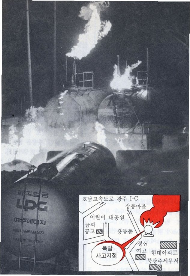 1992년 2월, 광주 북구 용봉동 ㈜해양도시가스 제1공장에서 발생한 가스 폭발 사고는 귀를 찢는 듯한 굉음과 함께 시작되었습니다. LP가스를 운반하던 탱크로리 차량이 가스 저장 탱크와 충돌하며 30톤급 가스 탱크 4기가 연이어 폭발했고, 순간적으로 약 100m 높이의 불기둥이 치솟았습니다. 폭발음은 5km 밖까지 퍼져나갔으며, 인근 아파트와 건물의 유리창이 파손되는 등 그 위력이 얼마나 대단했는지 짐작게 합니다. 당시 약 1만 명의 주민이 긴급 대피하는 소란이 벌어지기도 했습니다.