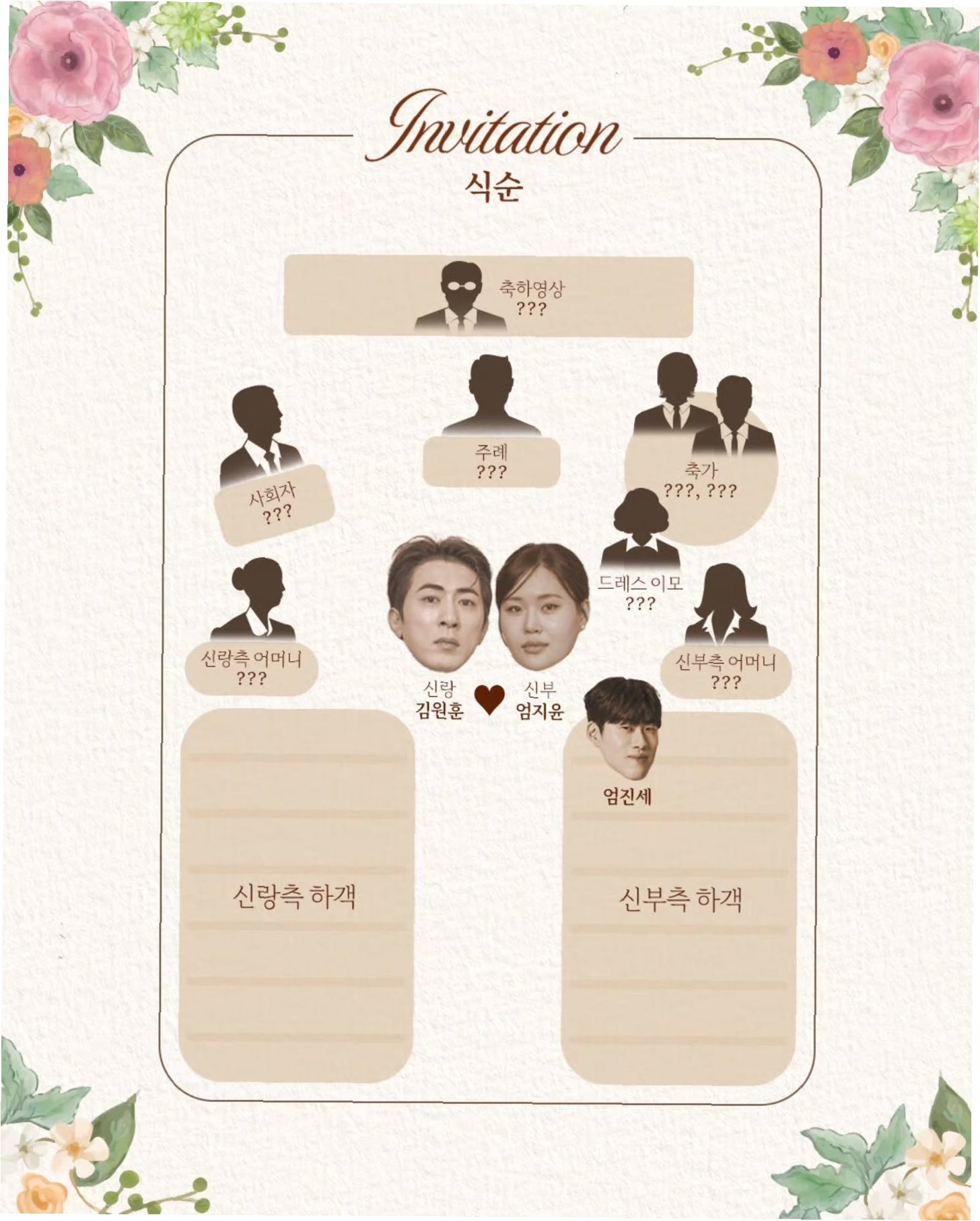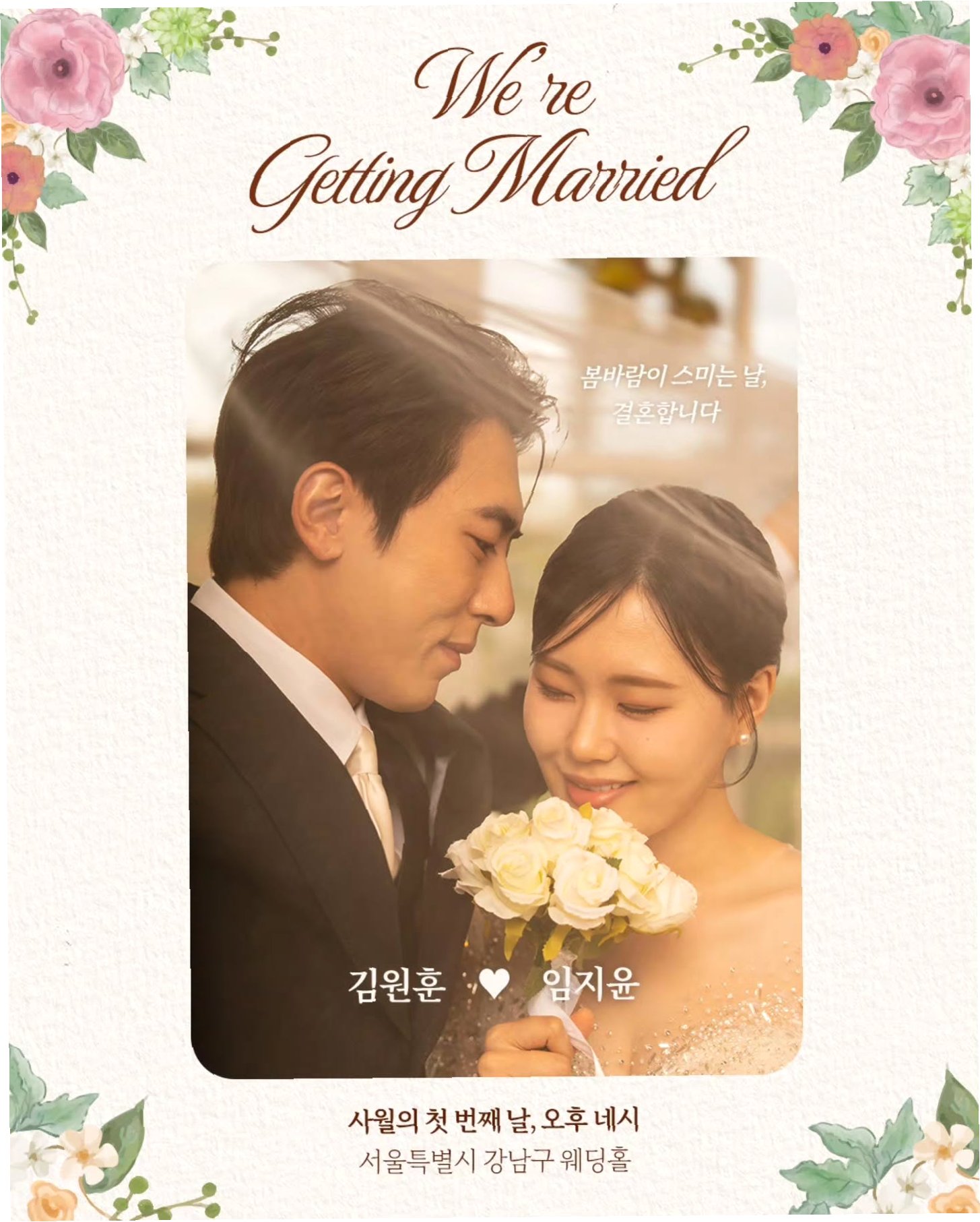 공개된 청첩장에는 '사월의 첫 번째 날, 오후 네시 서울특별시 강남구 웨딩홀'이라는 결혼 날짜와 장소가 명시되어 있습니다. 김원훈은 소중한 분들께 직접 청첩장을 전달하고 싶지만, 오랜만에 연락하는 것이 부담이 될까 염려되어 조심스럽게 소식을 전한다고 밝혔습니다. 또한, 신혼여행 예산으로 인해 식대 보증 인원을 150명으로 제한하게 된 점에 대해 양해를 구하며 팬들의 이해를 당부했습니다.