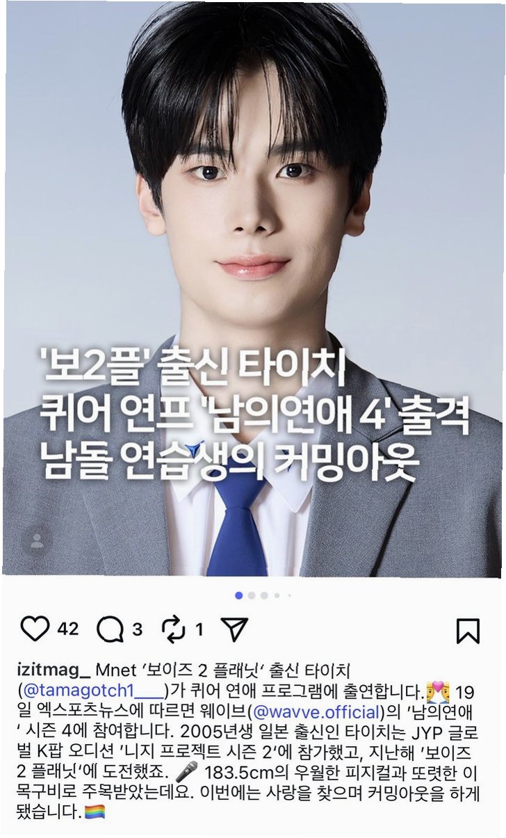 JYP 출신 연습생 타이치가 '남의연애4'에 출연하며 '보이즈2플래닛' 탈락 이후 새로운 도전을 시작합니다. 성소수자임을 밝힌 그의 용기 있는 결정과 함께, '남의연애4'를 통해 보여줄 그의 진솔한 모습에 많은 기대가 쏠리고 있습니다. 23일부터 웨이브를 통해 공개되는 '남의연애4'에서 타이치의 활약을 기대하며, 그의 아름다운 도전을 응원합니다.