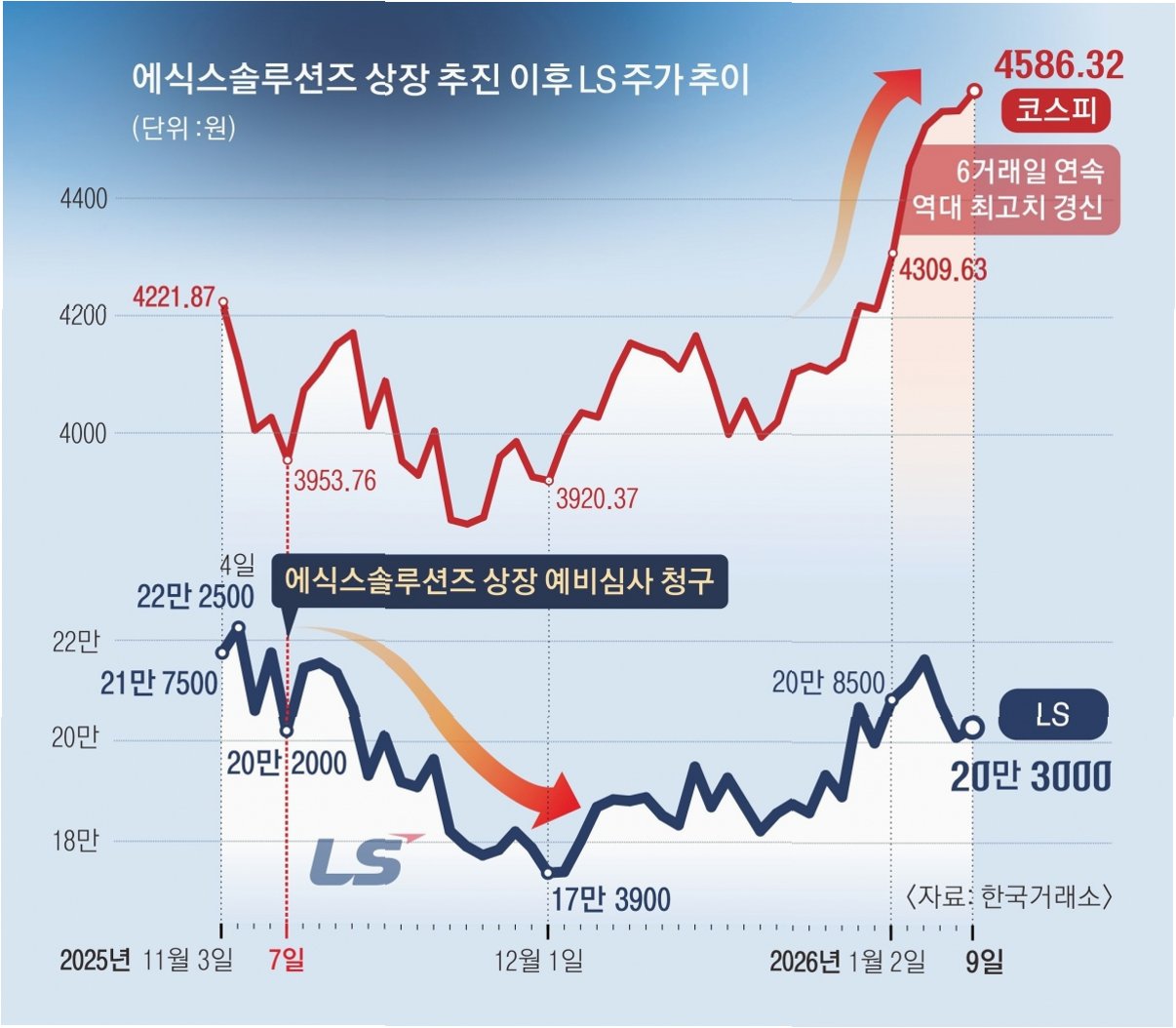 LS그룹의 중복 상장 시도: 증시 부양 기조에 역행?정부가 증시 부양을 외치는 가운데, LS그룹의 계열사 중복 상장 추진이 논란의 중심에 섰습니다. 에식스솔루션즈(에식스)의 유가증권시장 상장을 위한 한국거래소 예비 심사 통과 여부에 시장의 이목이 집중되고 있습니다. 이는 지난해 상법 개정 이후 잠잠해지는 듯했던 중복 상장 논란을 다시 불러일으킬 수 있다는 우려를 낳고 있으며, 정부의 '코스피 5000' 목표 달성에도 부담으로 작용할 수 있다는 지적이 제기됩니다. 에식스 상장, LS 주가에 미치는 영향은?에식스의 상장 추진 이후 LS 주가는 긍정적인 흐름을 보이지 못하고 있습니다. 특히 코스피가 연일 최고치를 경신하는 것과는 대조적인 모습입니다. 에식스 예비 심사 청구일인 지난해 11월 7일, LS ..